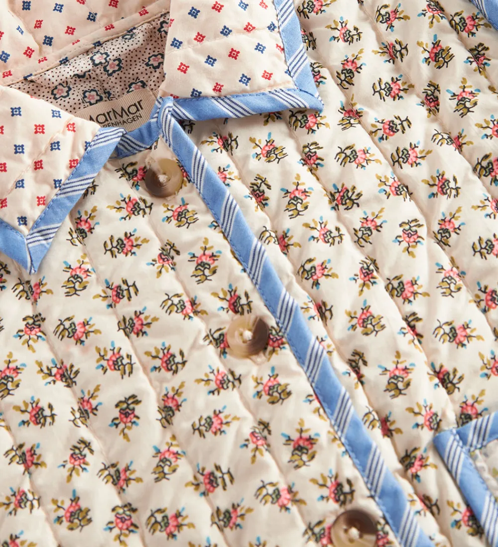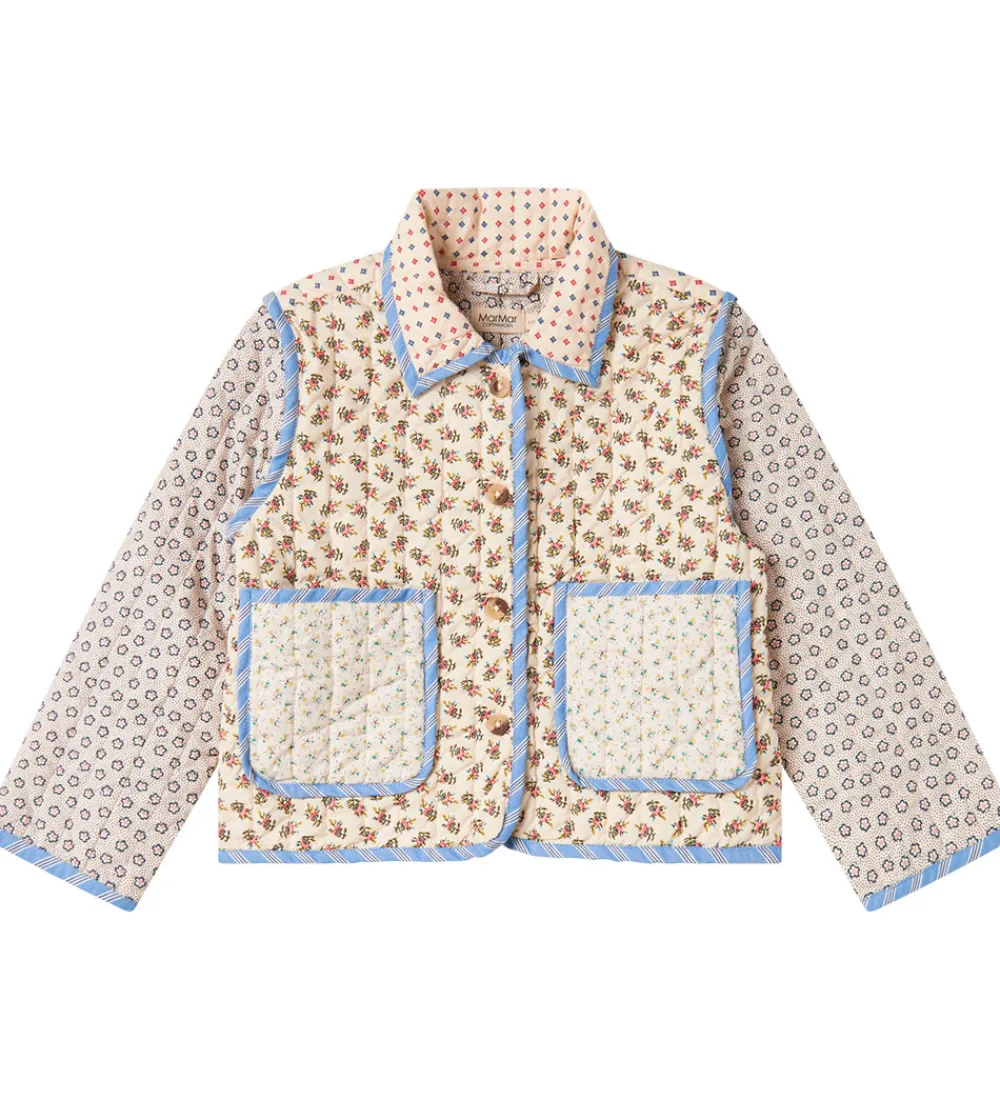 Charmerende MarMar jakke i en farverig kombination med forskellige blomsterprint. MarMar jakken har lange ærmer og to store forlommer, hvilket skaber et stilfuldt og funktionelt design. Den lukkes praktisk med gennemgående knapper på fronten.