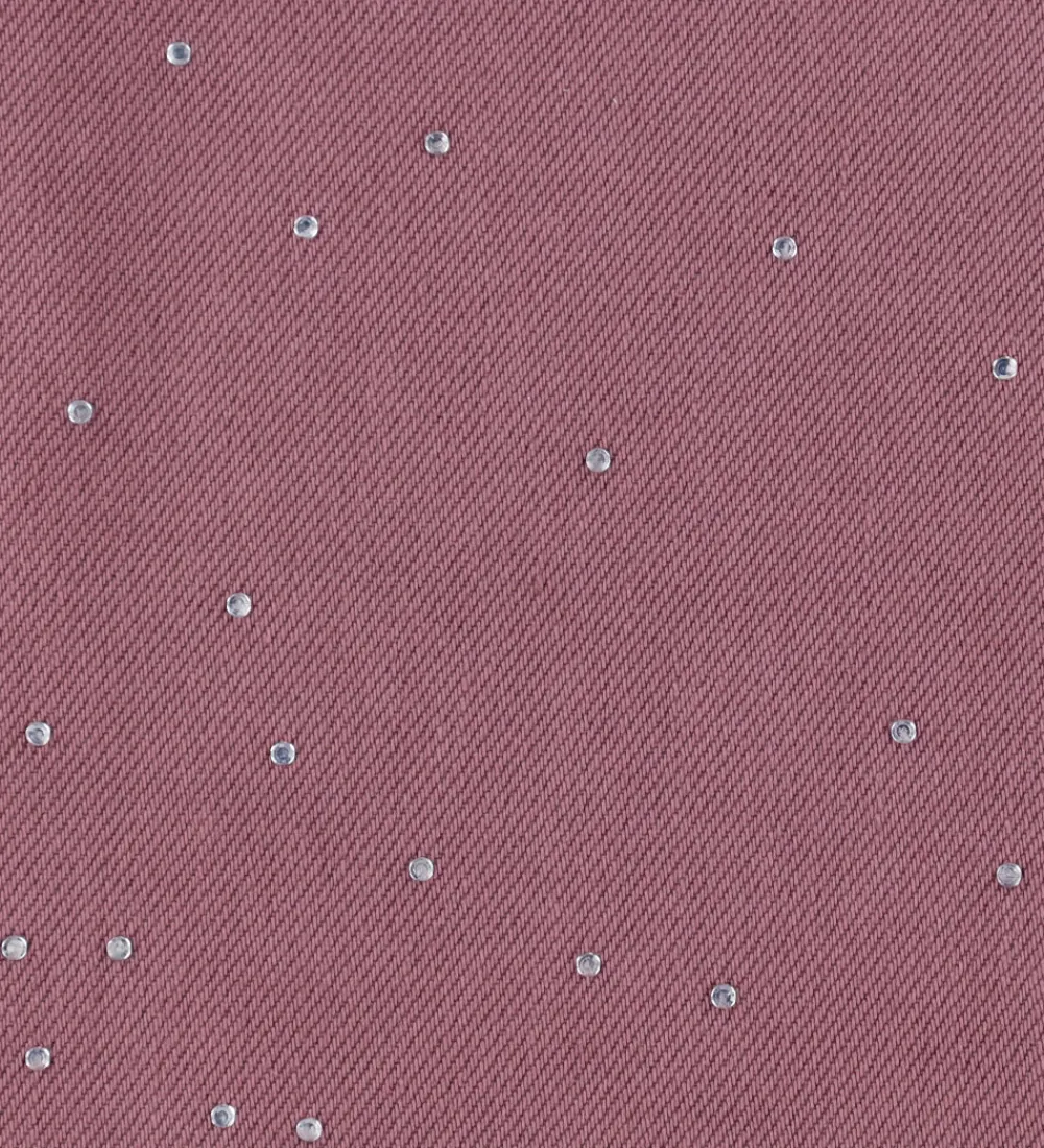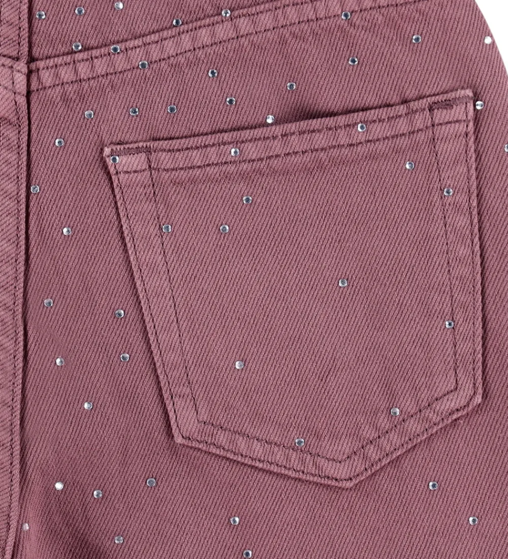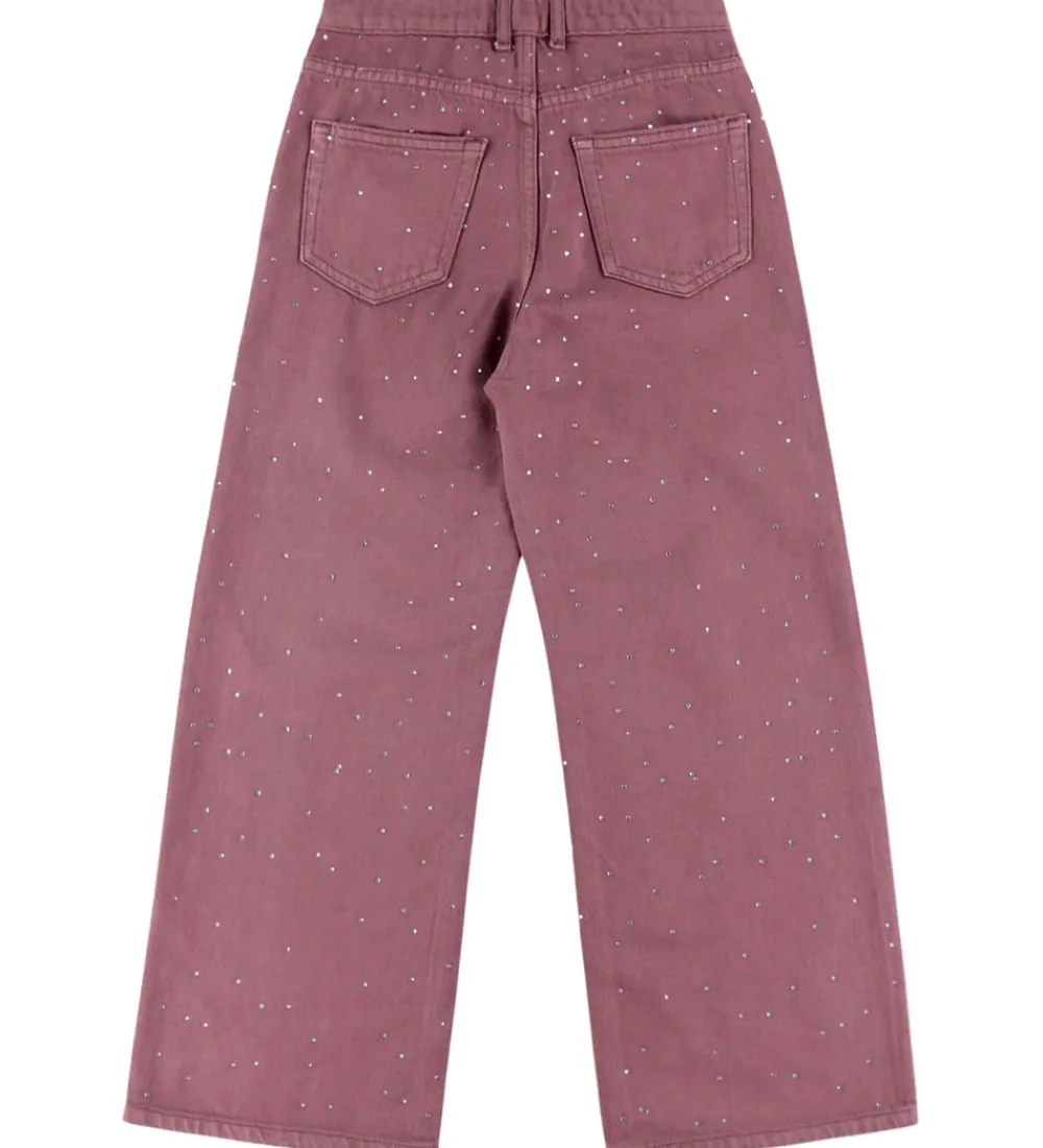 Seje Kids Only jeans i rødbrunt denim med små similisten fordelt på for- og bagside. Jeansene har en elastisk talje, som kan justeres med knapper indvendigt. De lukkes foran med en hægte og lynlås, og de har praktiske bæltestropper. Jeansene har lommer foran og bagpå. De har en afslappet pasform med vide ben.