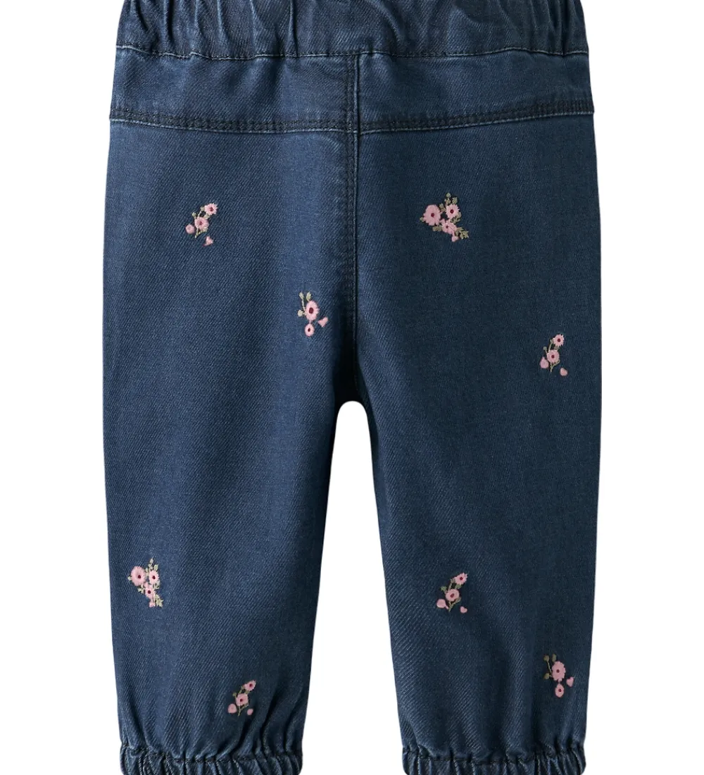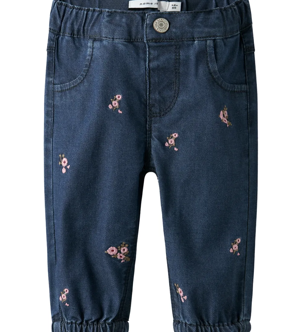 Flotte Name It jeans i mørkeblå denim med fine blomsterbroderier i lyserøde nuancer. Name It jeansene har en elastisk talje, som kan justeres med knapper indvendigt. De har en knaplukning foran og smarte snydelommer. I benåbningerne er der elastik, som giver en god pasform.