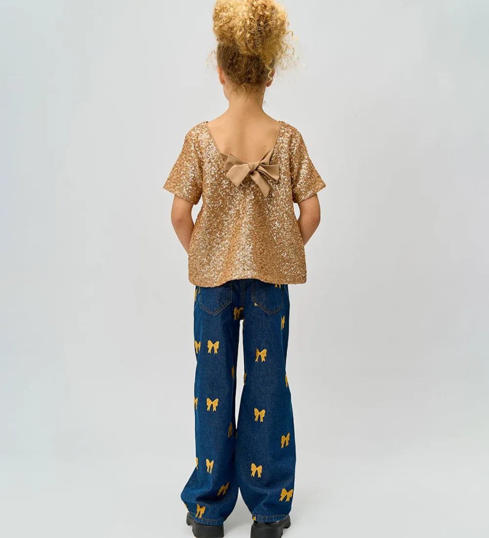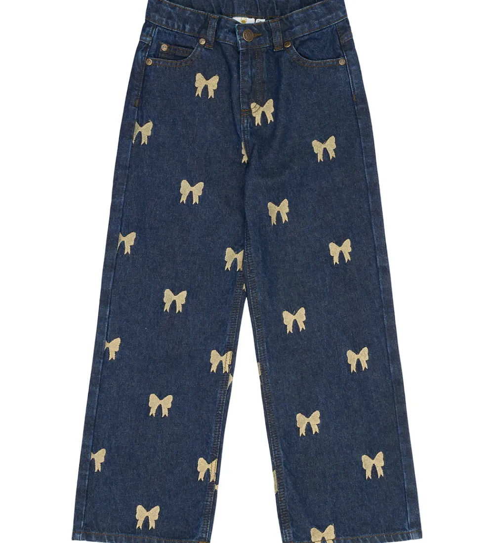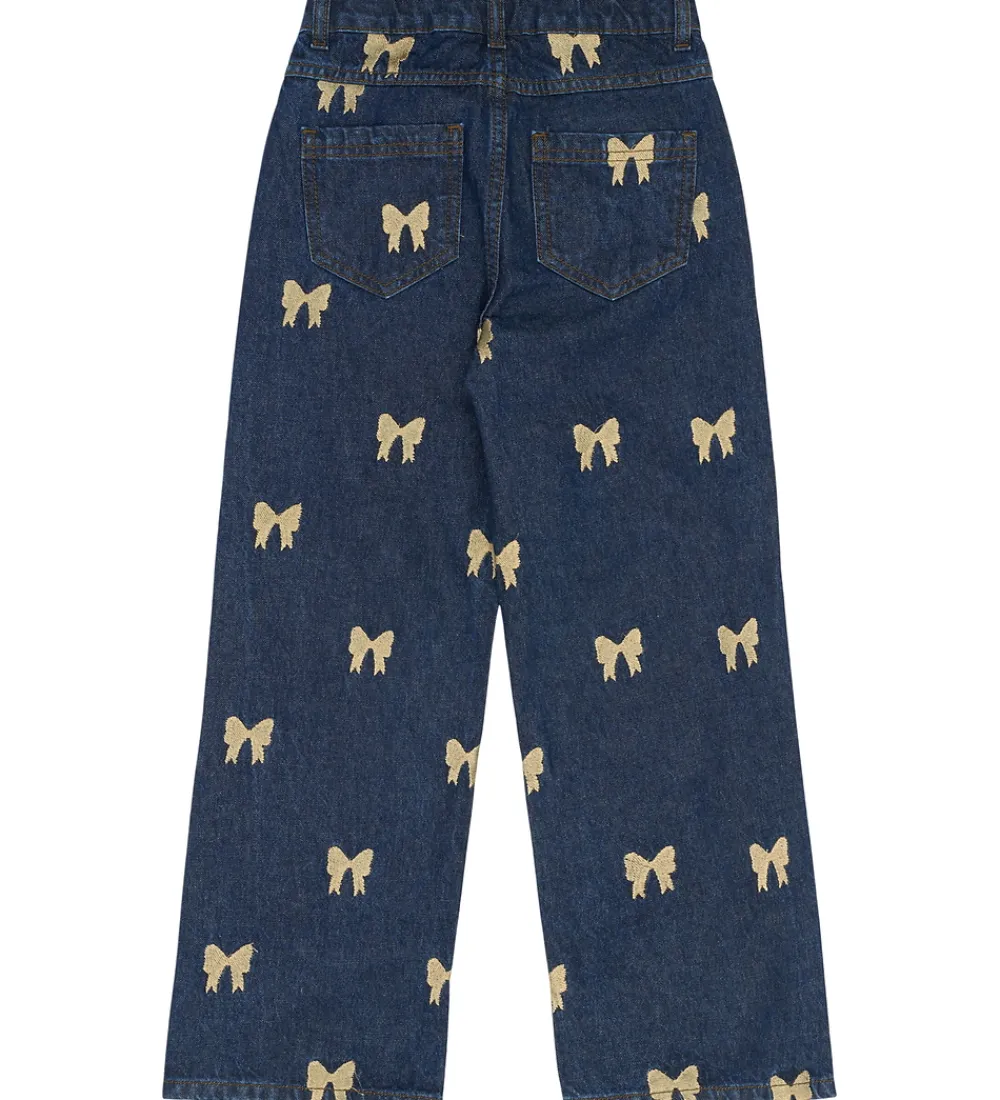 Stilfulde jeans fra The New i mørkeblå med broderede sløjfer i guld. The New jeansene har en elastisk talje, som kan justeres med knapper indvendigt. De lukkes fortil med en hægte og lynlås. Jeansene har bæltestropper og lommer på for- og bagside. De har en afslappet pasform med brede ben.