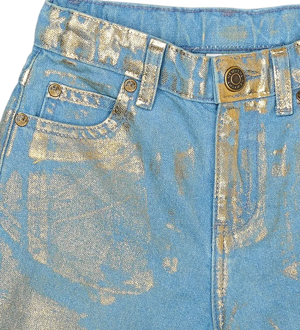 Festlige The New jeans i blå denim med guld glimmer. The New jeansene har en elastisk talje, som kan justeres med knapper indvendigt. De lukkes fortil med en hægte og lynlås. Jeansene har bæltestropper og lommer på for- og bagside. De har en afslappet pasform med vide ben.
