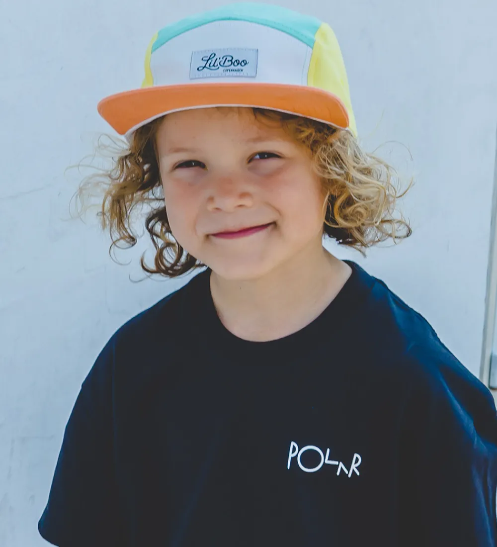 Dejlig Lil’ Boo kasket med flotte blokfarver i gul, grøn og lysegrå, samt en orange skygge. Fortil er der en fin logoapplikation.