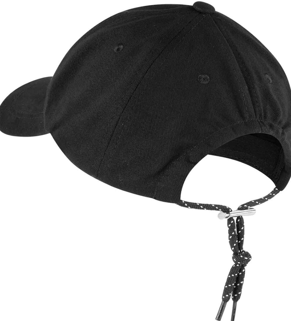 Mads Nørgaard kasketten har en buet skygge, og den strammes ind i nakken med en snøre i sort og hvid og med sølvfarvet spænde.