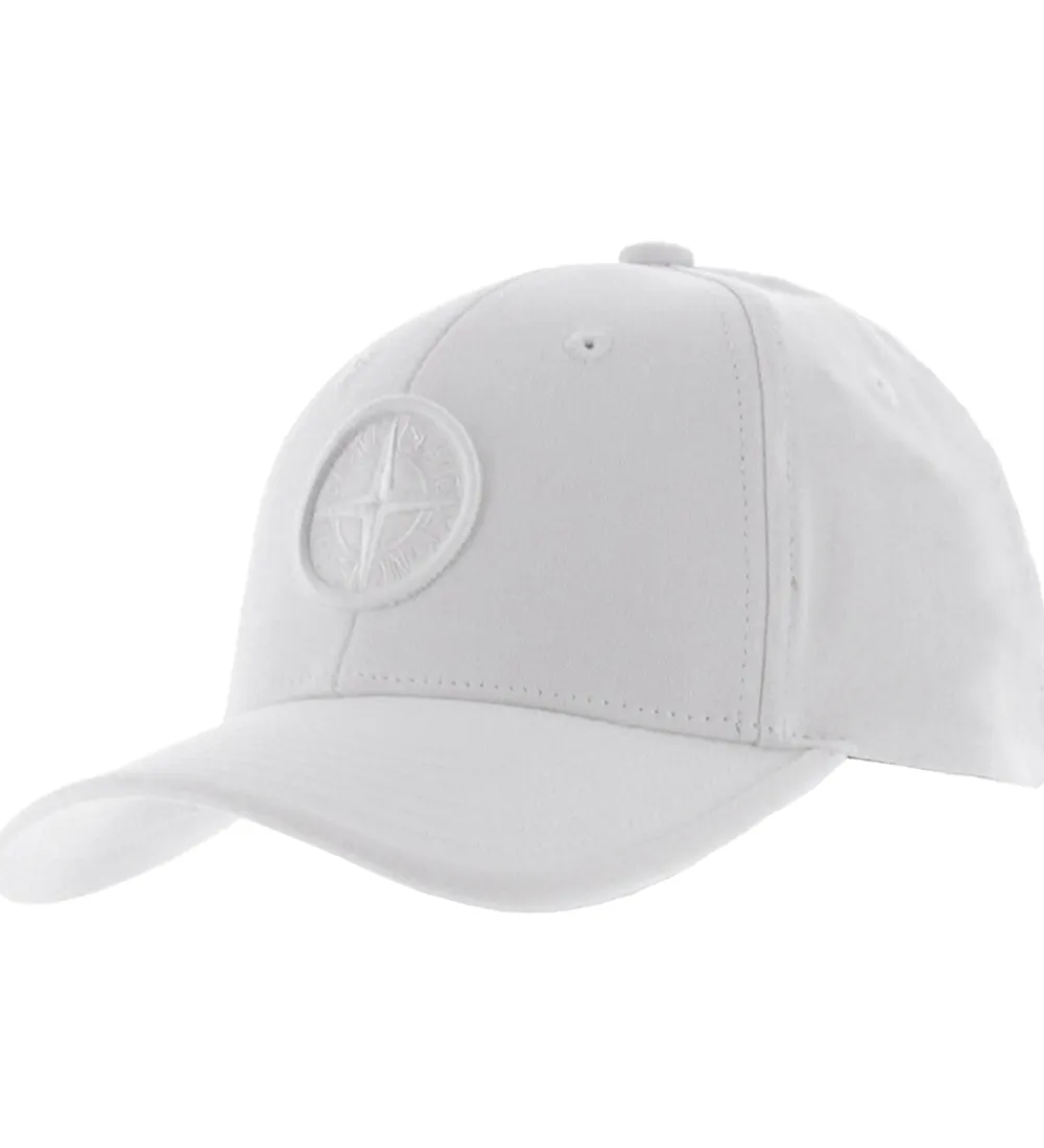 Fin Stone Island kasket i ensfarvet hvid, og fortil er der broderet et stort logo.