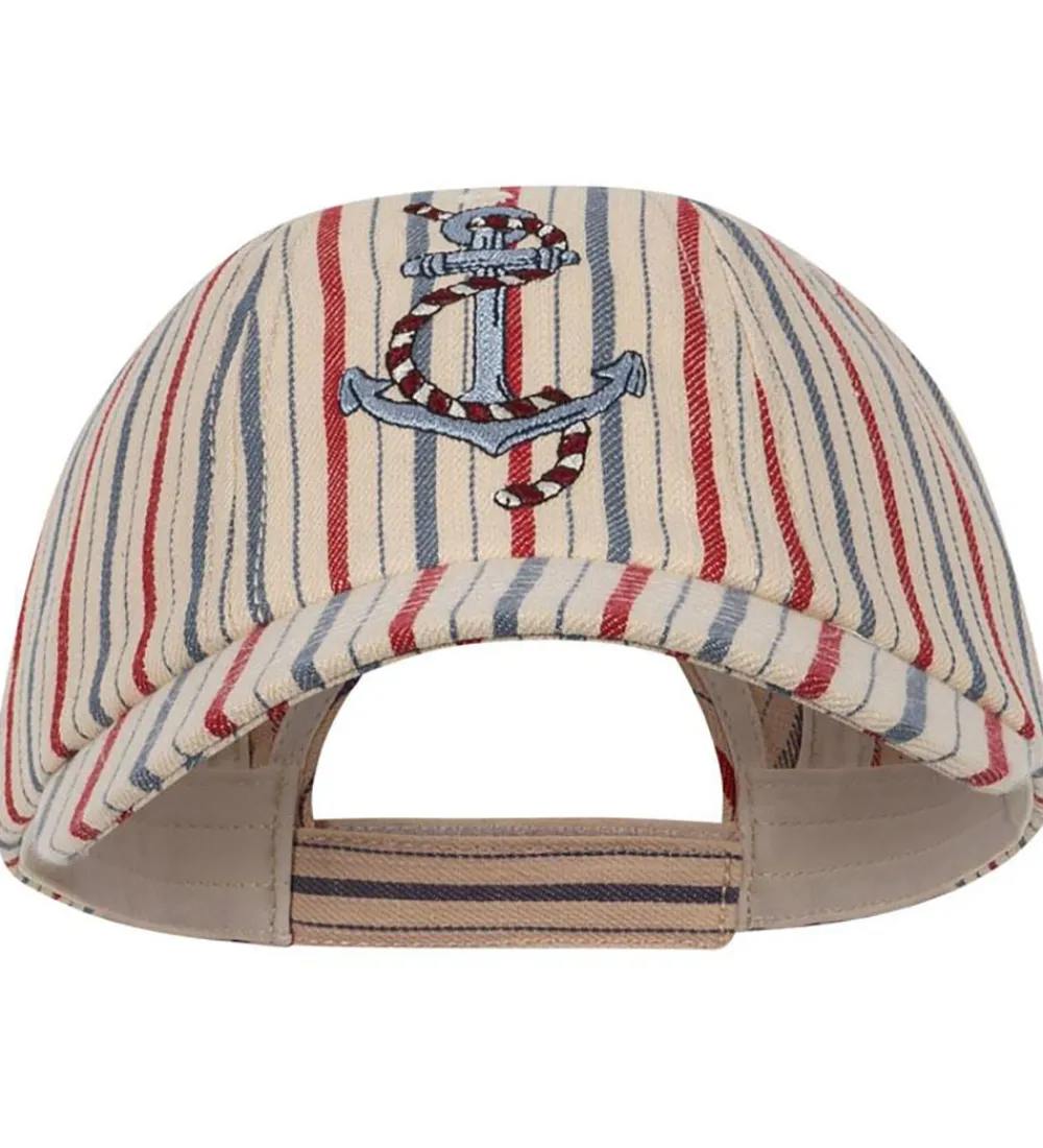 Skøn Konges Sløjd kasket i en beige farve med striber i rød og blå. Kasketten har et flot anker broderet på fronten, som tilføjer en sjov detalje til det stilfulde design.