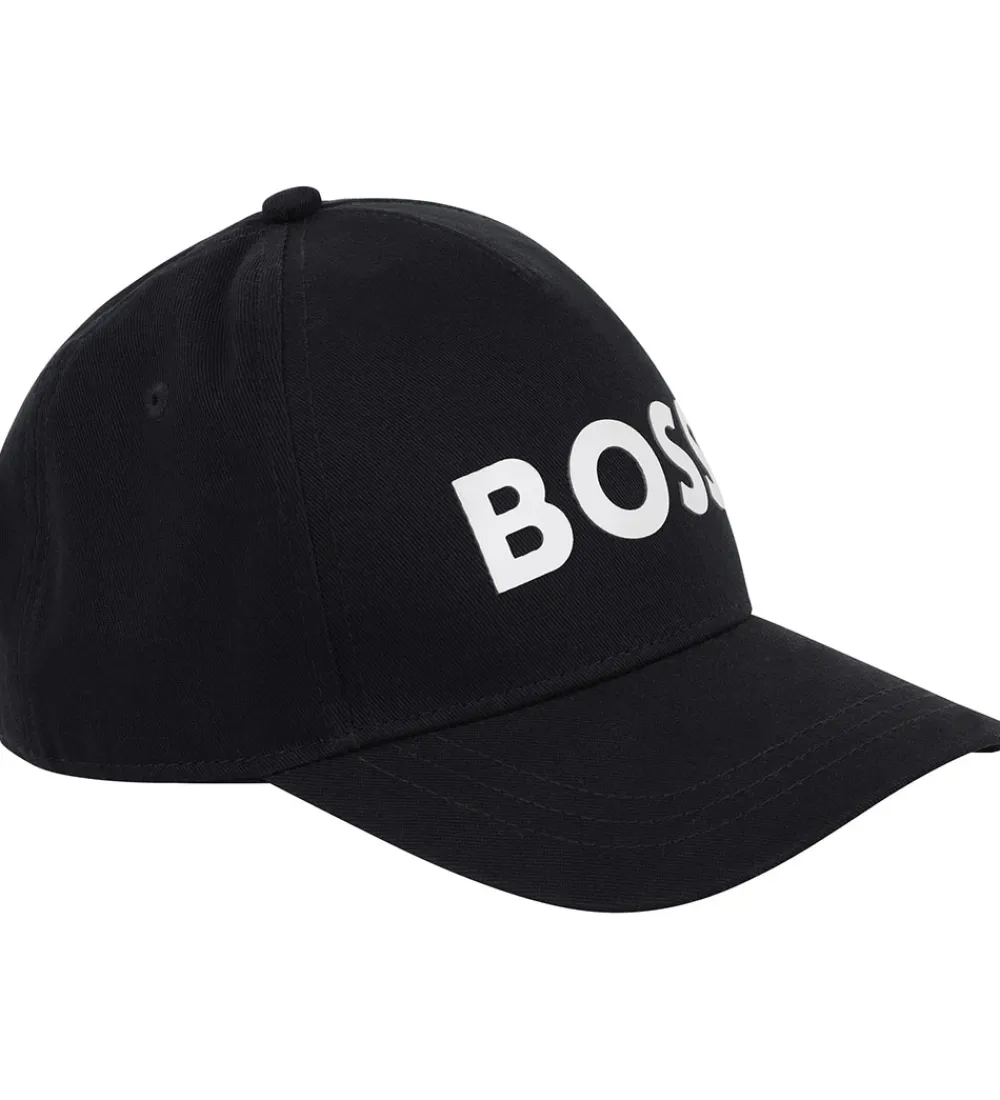 BOSS kasketten har en buet skygge, og den strammes ind i nakken med en hvide plastikrem.