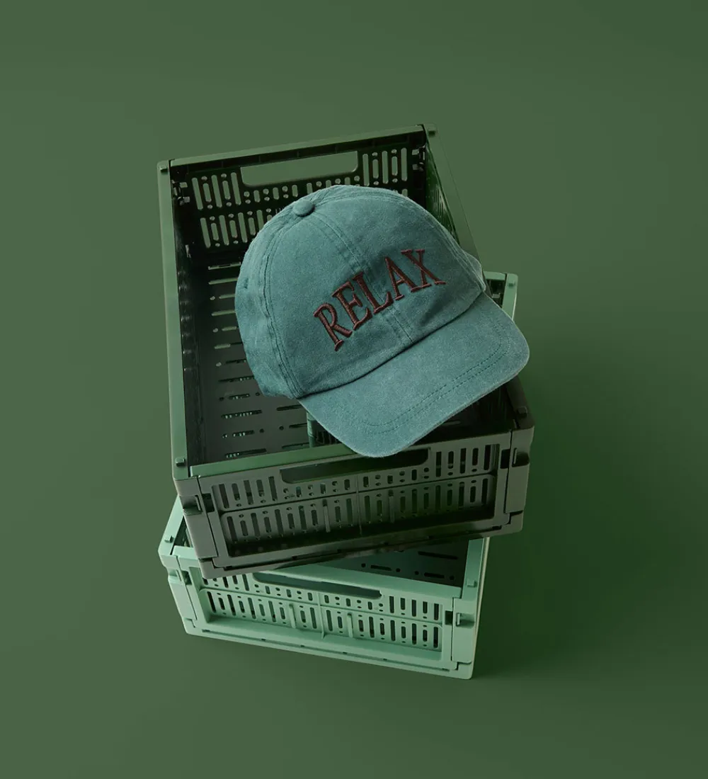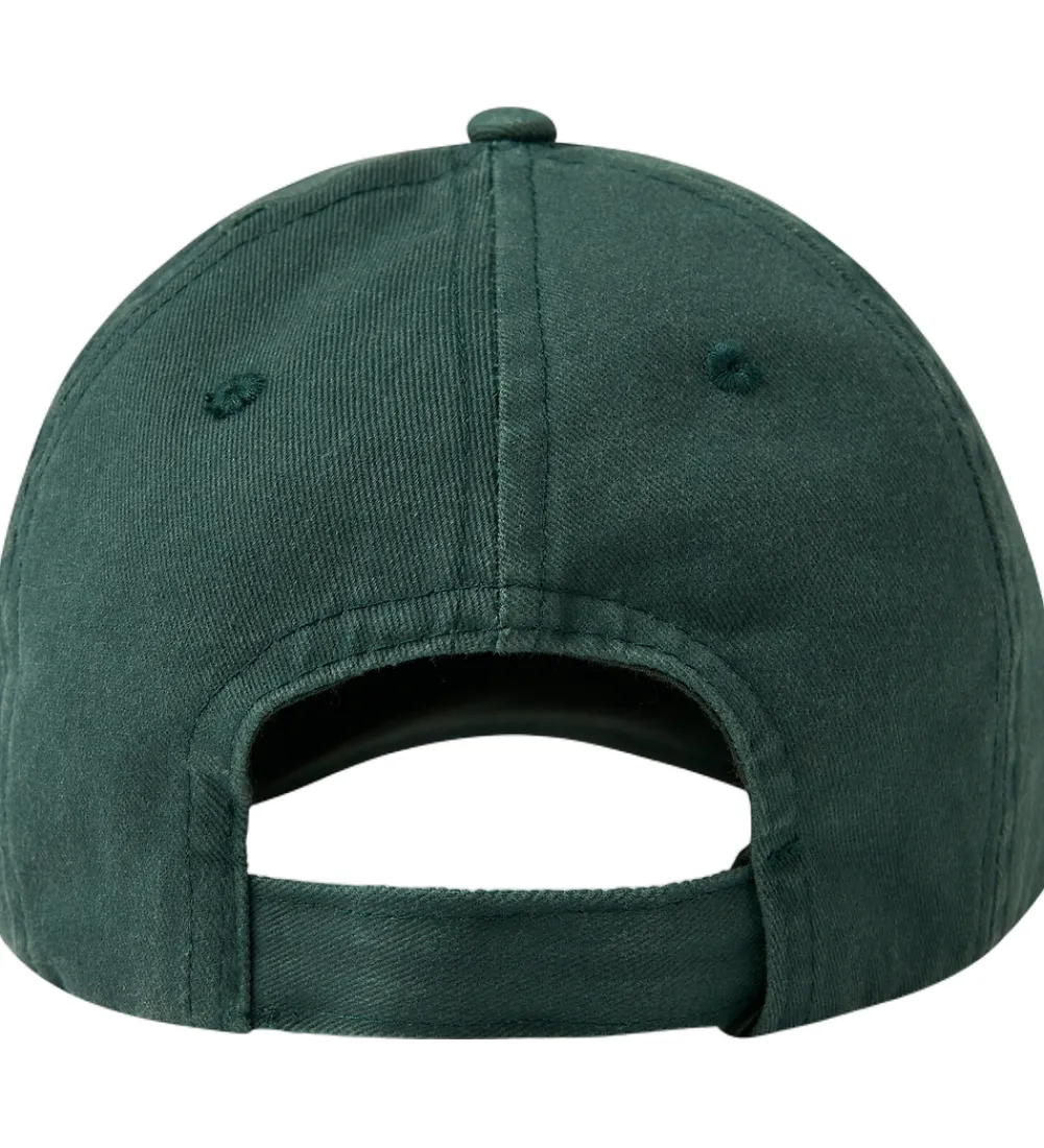 Elegant Name It kasket i en dyb, grøn nuance med teksten “RELAX” broderet i brun. Kasketten har en klassisk, buet skygge, der giver skygge fra solen.