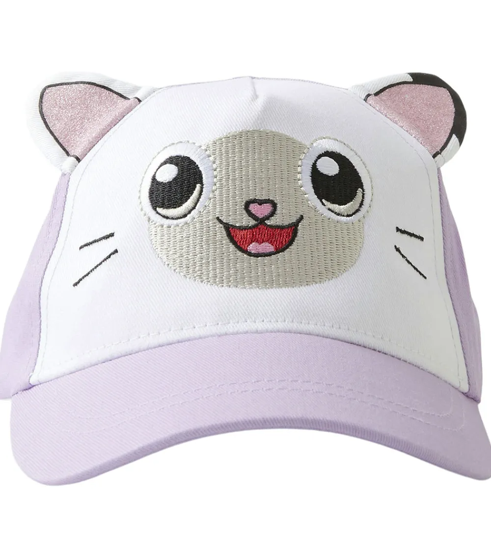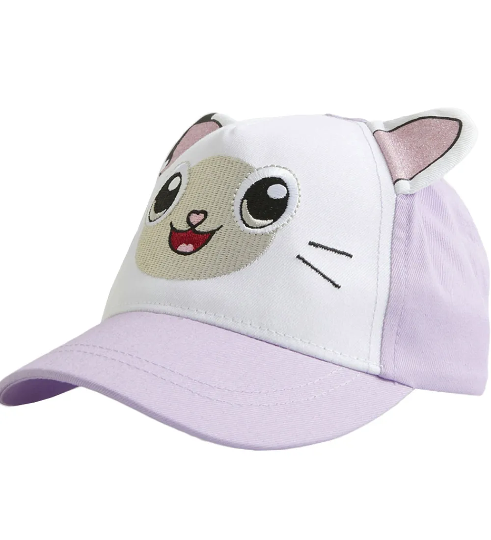Lækker Name It kasket i en lys lilla med et sødt katteansigt af Pandy Paws fra Gabby’s Dollhouse på hvidt forstykke. Kasketten har ører med glimmer, der tilføjer et sjovt indtryk til ethvert outfit. Name It kasketten er en sikker vinder.