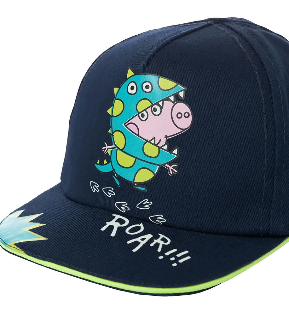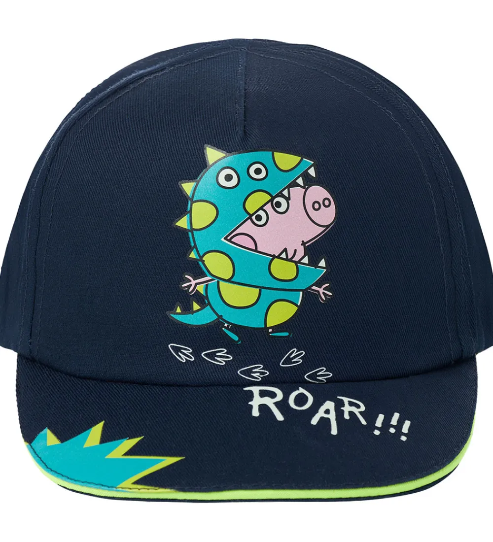 Sjov Name It kasket i en mørk navy nuance med et farverigt print af Gustav Gris iført en dino-dragt. Kasketten har en god pasform, der sikrer komfort hele dagen.