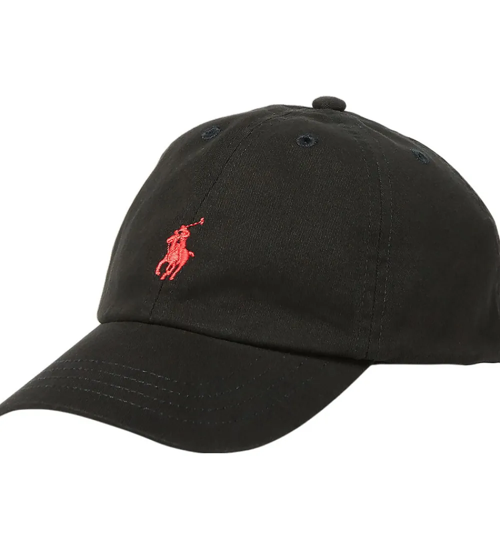 Lækker Polo Ralph Lauren kasket i sort med et rødt logo broderet fortil, og i nakken står der “Polo” broderet i rød.
