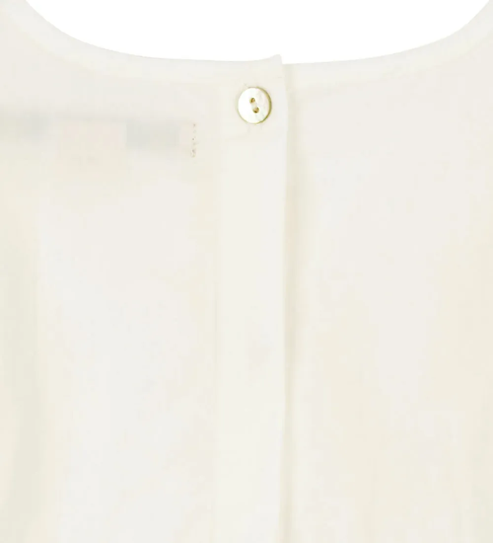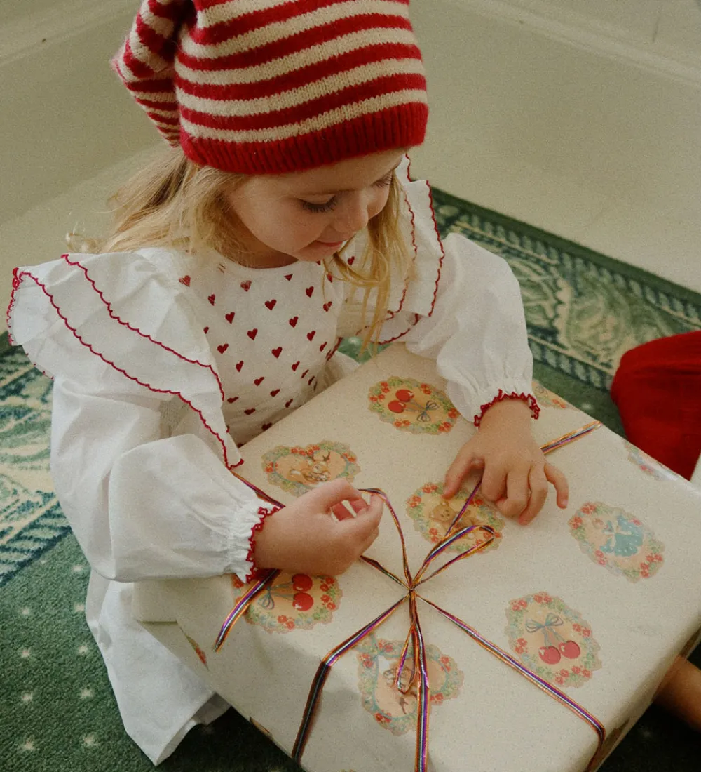 Elegant Konges Sløjd kjole i hvid i med små broderede hjerter i rød. Kjolen har lange ærmer og fine flæsedetaljer langs kraven. Konges Sløjd kjolen har elastikker ved ærmerne, som giver en blød finish, og den har en elastik i ryggen. Nedenunder falder skørtet med massr af vidde. Kjolen er lavet i et enkelt lag i en fastvævet kvalitet, og den lukkes på ryggen med knapper.