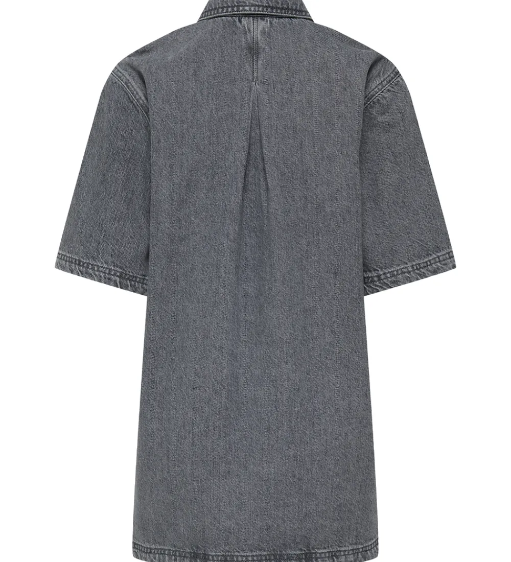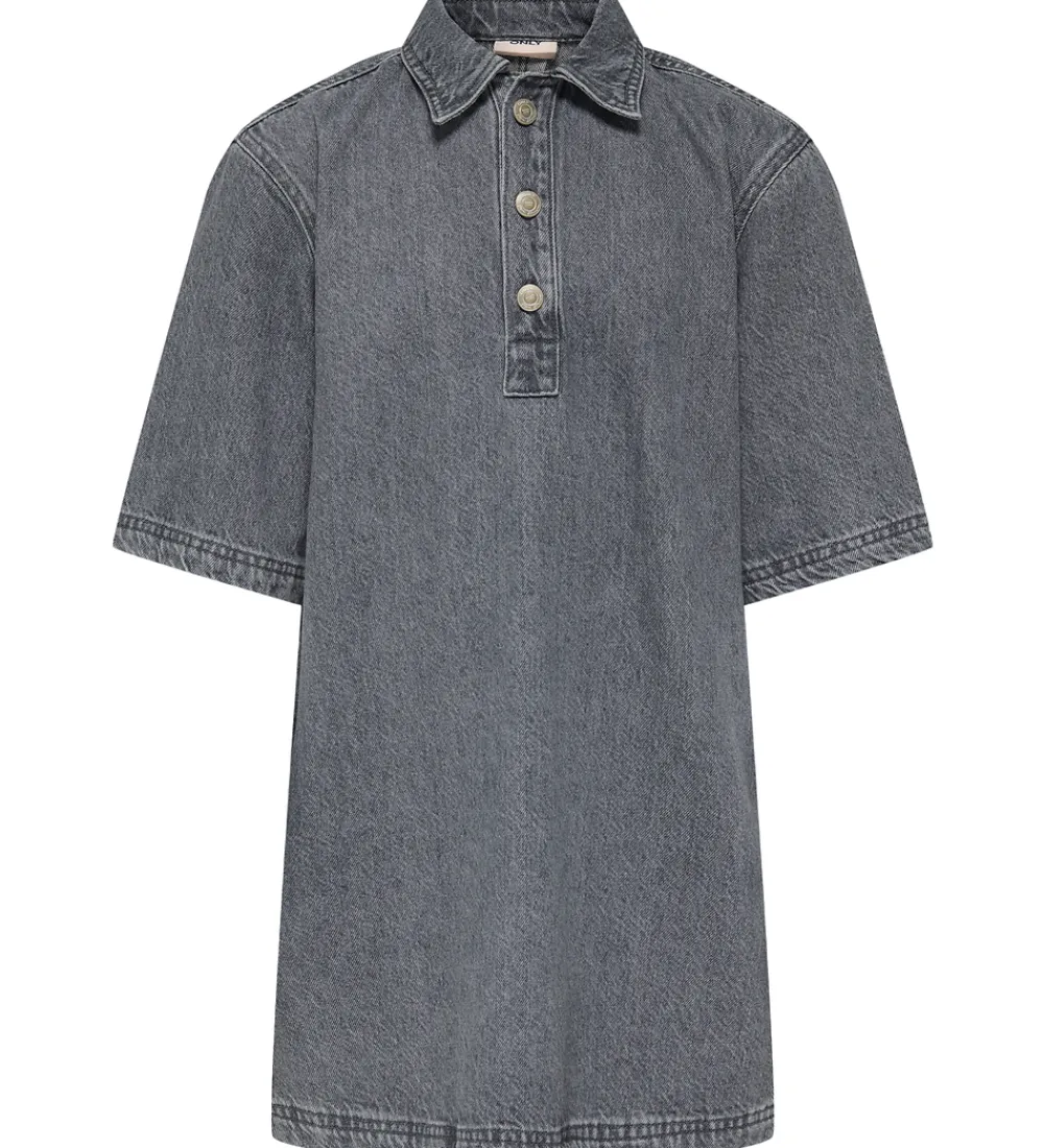 Elegant Kids Only kjole i gråt, stonewashed denim i en fastvævet kvalitet. Kjolen har 3/4 lange ærmer, og den har en klassisk krave. Foran har Kids Only kjolen en knaplukning med sølvfarvede knapper, og den har et flot A-snit med en en god vidde.