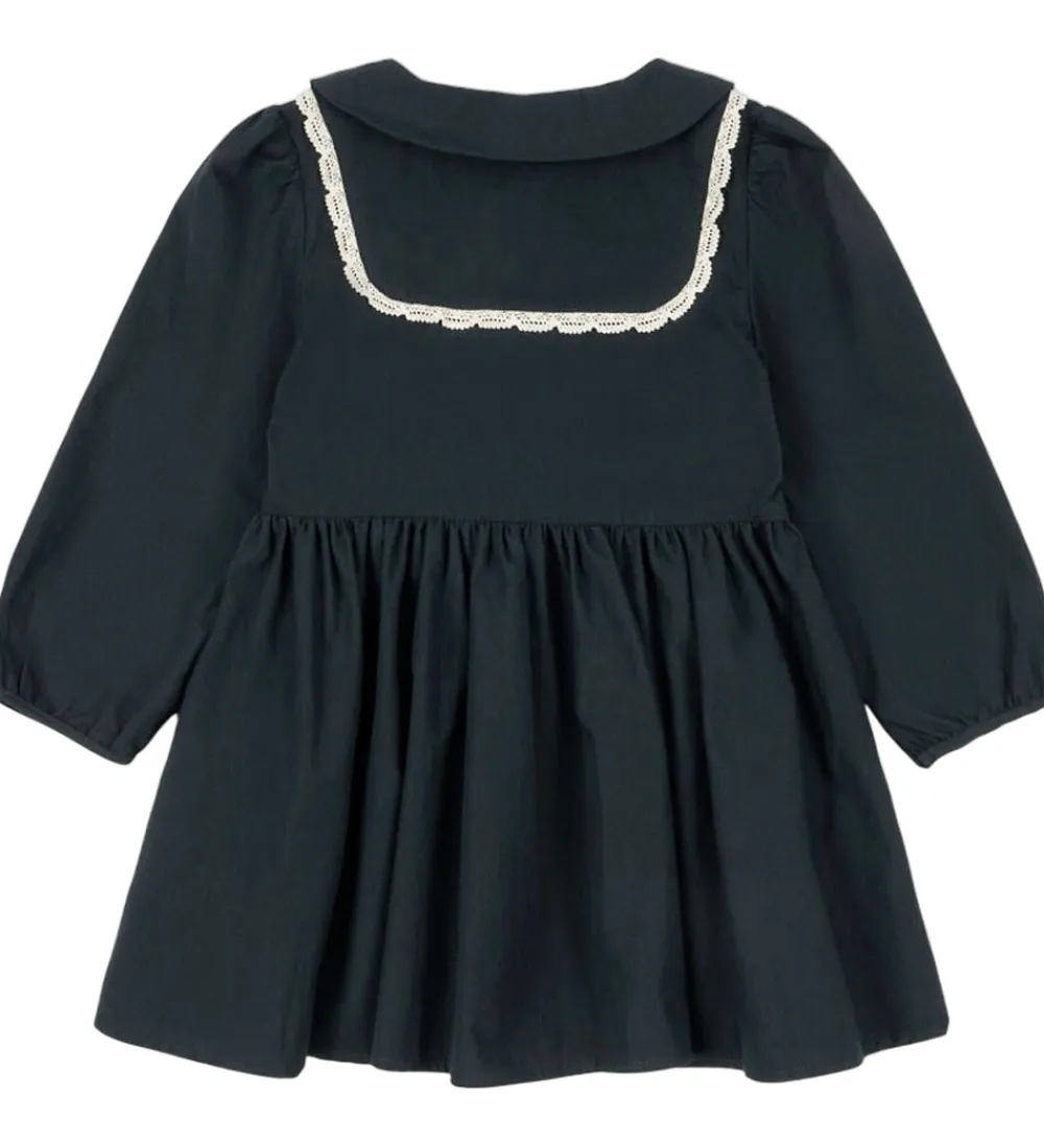 Elegant Konges Sløjd kjole i navy, og fortil i toppen er der hvide blonder og broderede, røde roser. Kjolen har æange ærmer med fufskuldre, og den har et skørt med en god vidde. Kjolen åbnes fortil med knapper, og den er lavet i en let, fastvævet kvalitet.