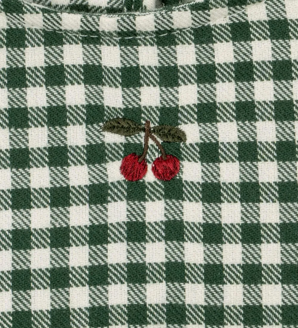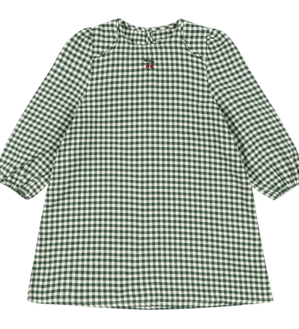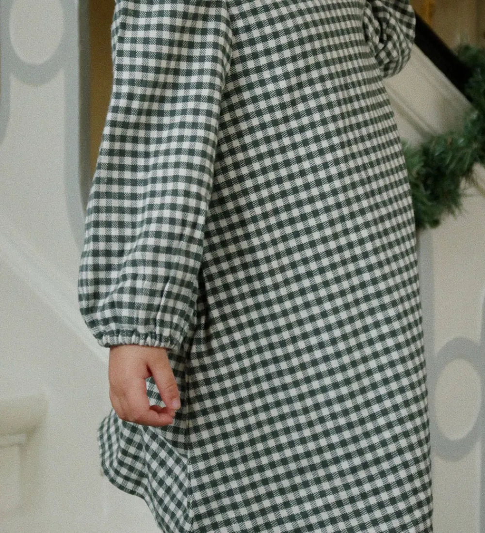 Stilfuld kjole fra Konges Sløjd med et ternet mønster i hvid og grøn. Konges Sløjd kjolen har lange ærmer med smalle elastikkanter, og den har et flot A-snit. Kjolen lukkes i nakken meden knap, og den er lavet i en let, fastvævet kvalitet.