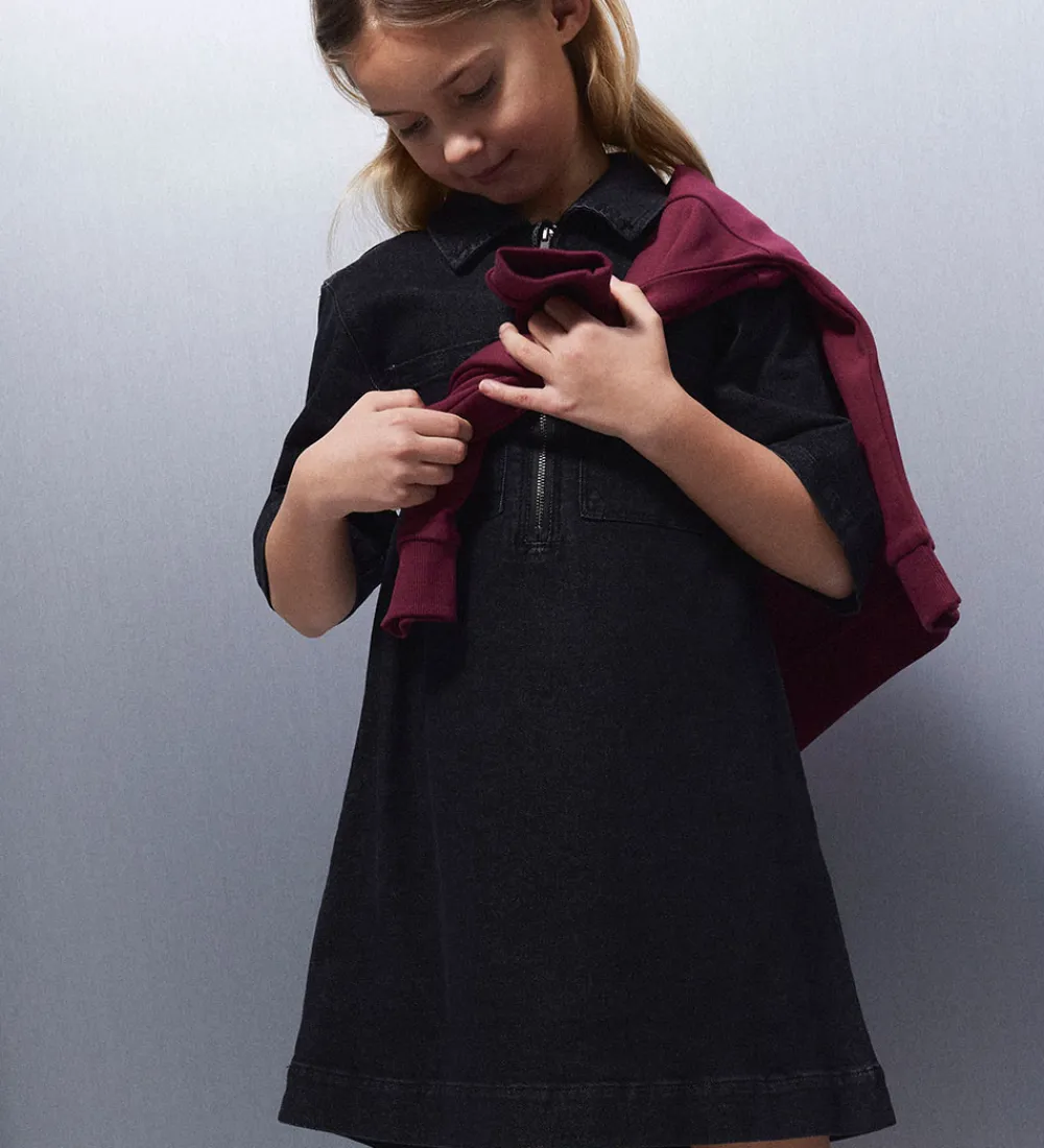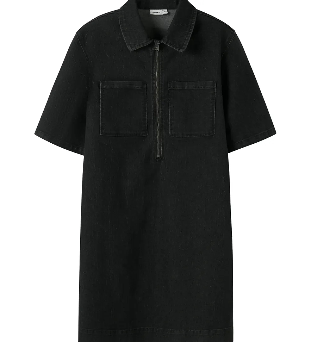 Stilfuld Name It kjole i koksgrå denim. Kjolen har korte ærmer og to bryslommer. Den har en praktisk lynlåslukning foran, der giver et moderne udtryk. Name It kjolen er designet med en klassisk krave, der komplementerer det enkle, men elegante look.