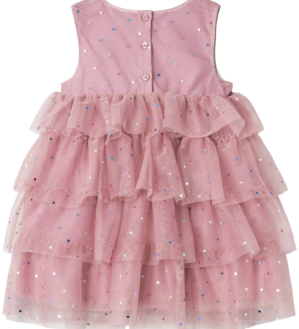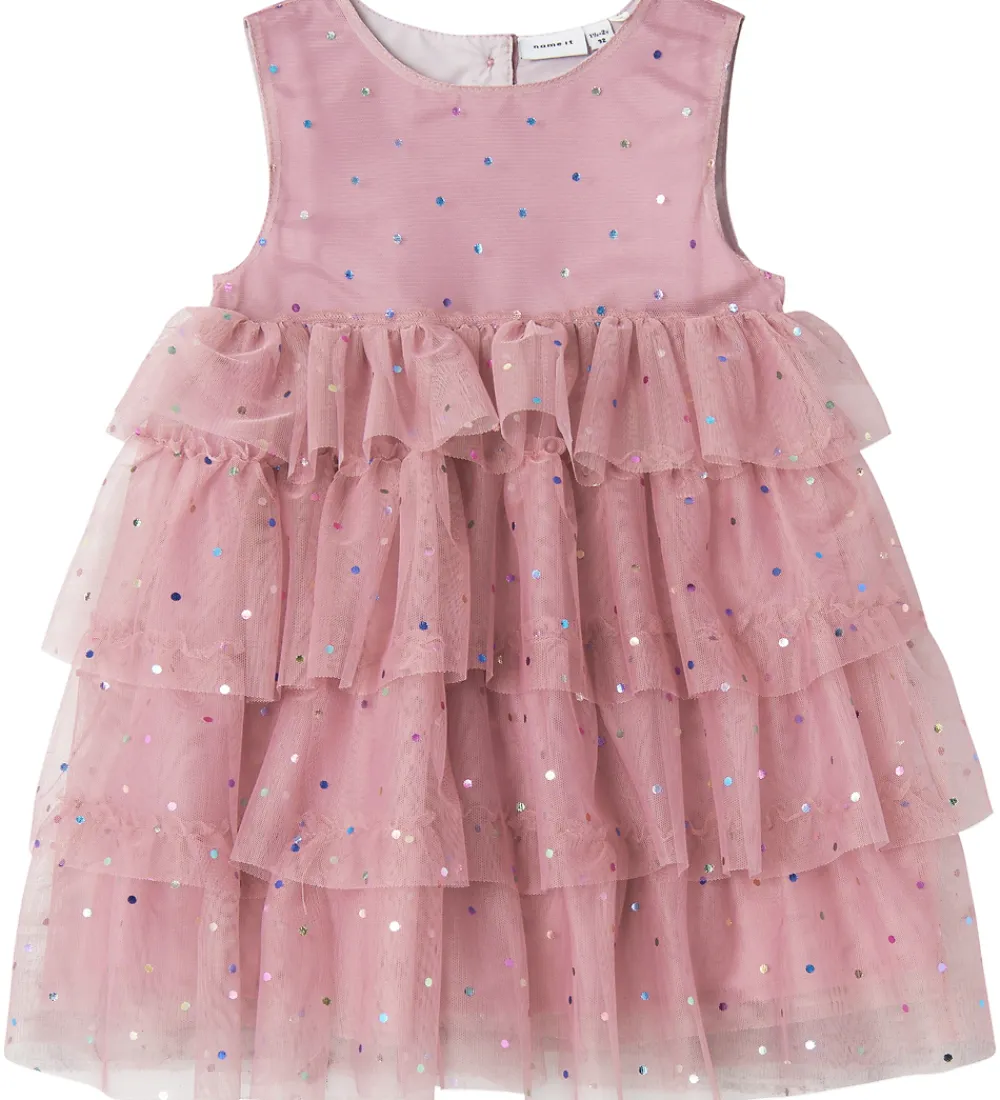 Smart Name It kjole i rosa med glitrende prikker i forskellige farver. Kjolen har en rund halsudskæring med knapper i nakken. Den har brede skulderstropper og et lagdelt skørt med flere vandrette flæser, der skaber fylde. De små farverige prikker giver kjolen et festligt præg.