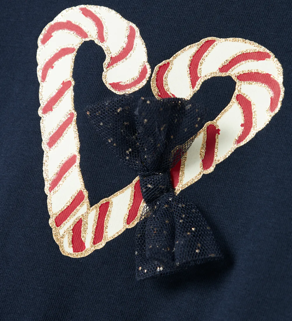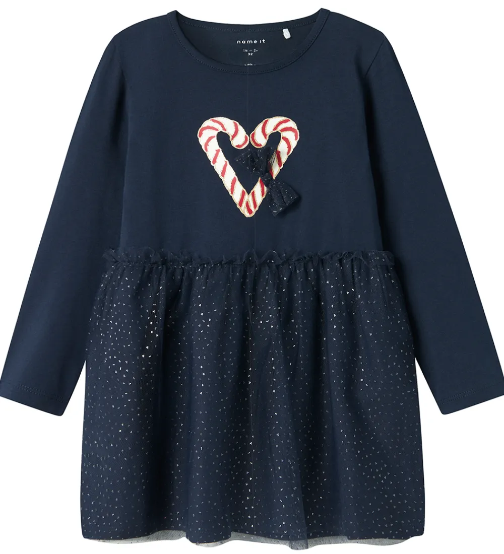 Elegant Name It kjole i navyblå med print på fronten af to slikstokke formet som et hjerte med glimmerdetaljer og en sløjfe i tyl. Kjolen har en rund halsudskæring og lange ærmer. Kjolen er skåret i taljen, hvor der er et lag tyl med glimmer på den nederste del af kjolen.