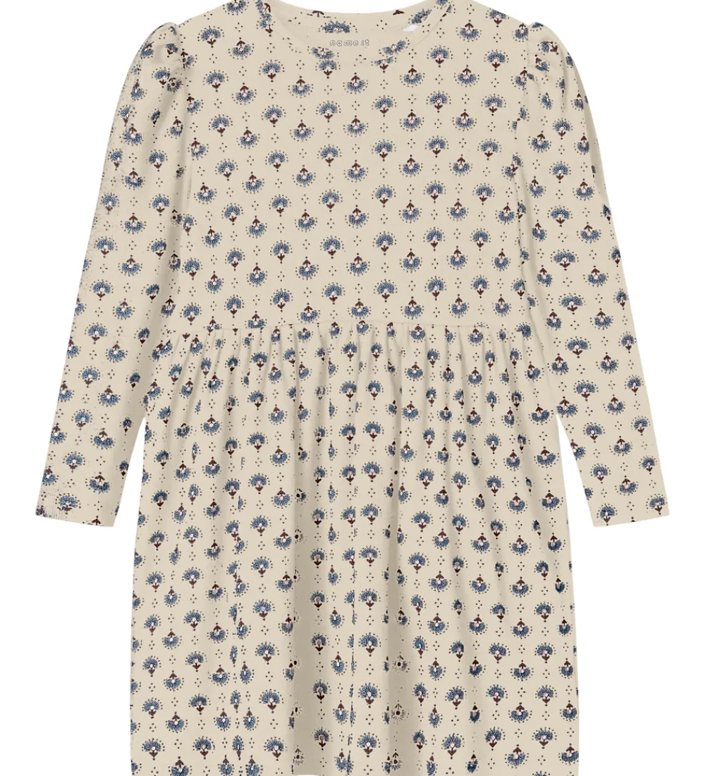 Elegant Name It kjole i lys beige med ribstruktur og blomsterlignende print i blå, brun og rosa. Kjolen har en rund halsudskæring og lange ærmer med puf ved skuldrene. I taljen er der en elastisk syning, som giver en flot pasform.