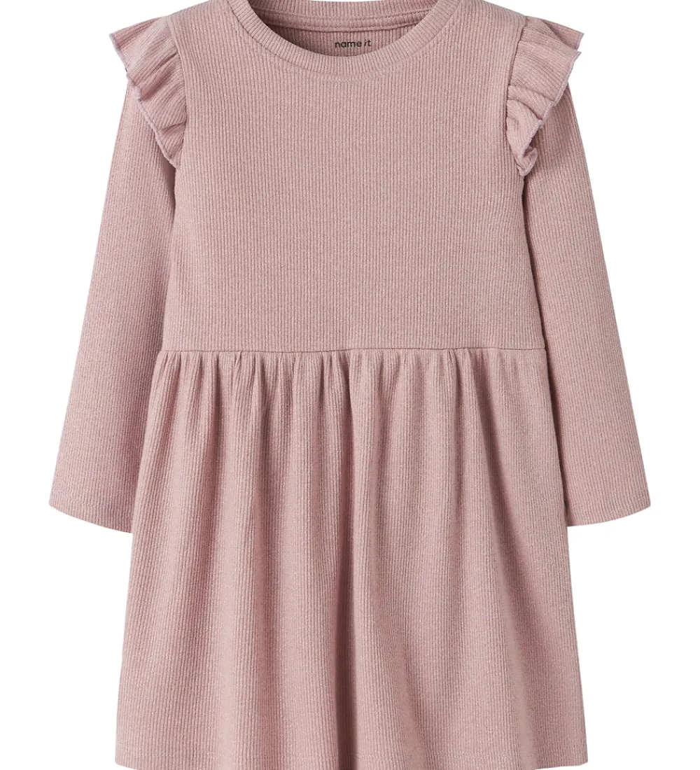 Elegant Name It kjole i en afdæmpet, lyserød nuance med guldfarvet glimmer. Name It kjolen har lange ærmer, rund halsudskæring og flæsedetaljer ved skuldrene. Kjolen er lavet i et ribbet stofmønster, der tilføjer struktur og et stilfuldt udtryk.