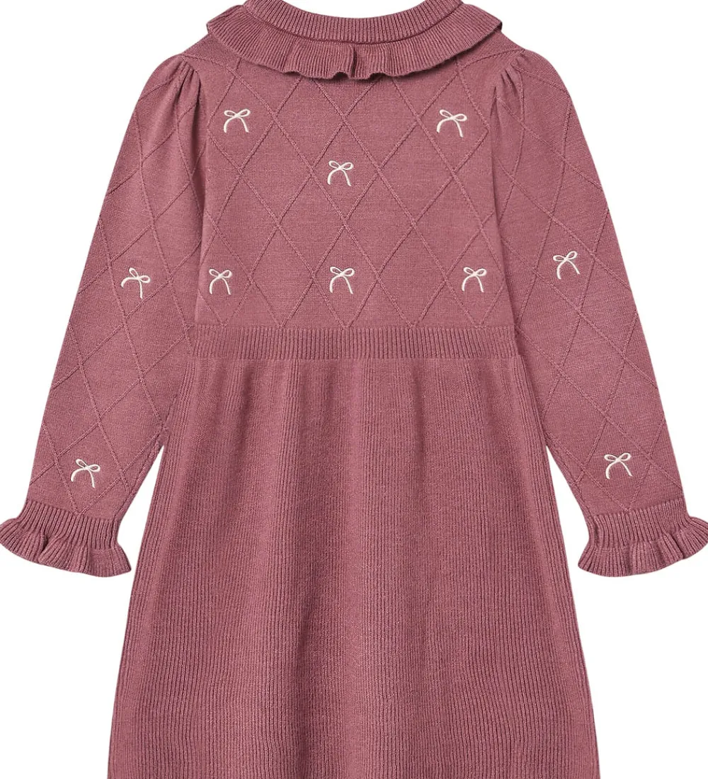 Elegant Fliink kjole i en dyb rosa nuance med broderede sløjfer øverst og på ærmerne. Kjolen har en flot strikket struktur med ternet mønster og skørt i ribstruktur. Kjolen har en rund halsudskæring med flæsekant og lange ærmer med rynker ved skuldrene og flæseafslutning. I taljen er der elastik, som giver et mere figursyet snit.