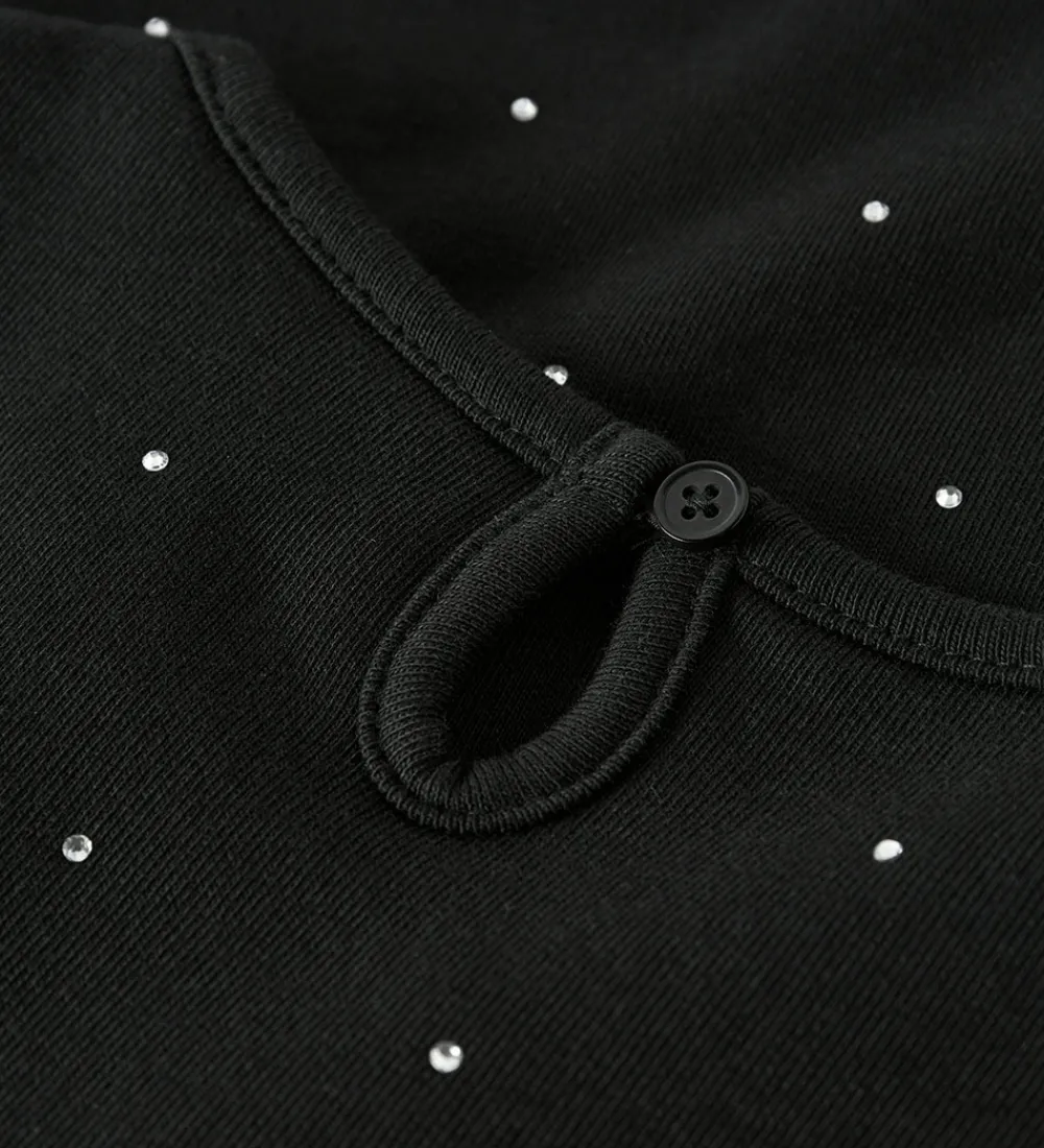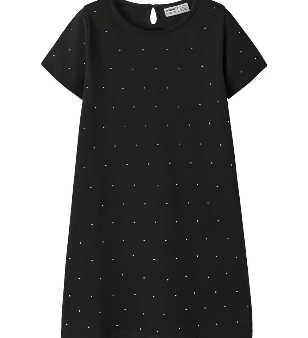 Elegant Name It kjole i sort med små similisten i sølv. Name It kjolen har korte ærmer og en rund halsudskæring med en knap i nakken. Kjolen er lavet i sweatkvalitet med en blød, børstet inderside.