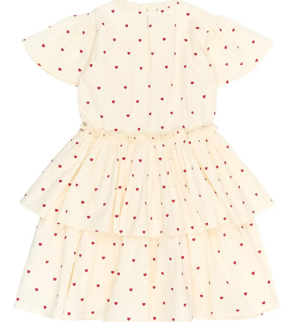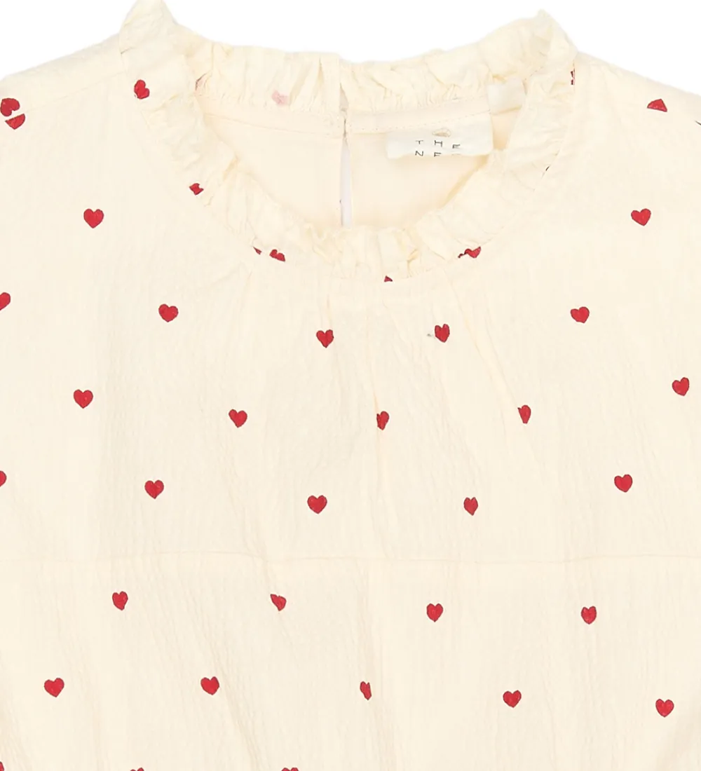 Elegant kjole fra The New i hvid med et sødt mønster af små, røde hjerter. Kjolen fra The New har korte ærmer og fine flæser nederst, hvilket giver et ekstra lag og struktur til designet. Den runde halsudskæring og det bløde materiale gør den til et behageligt valg.