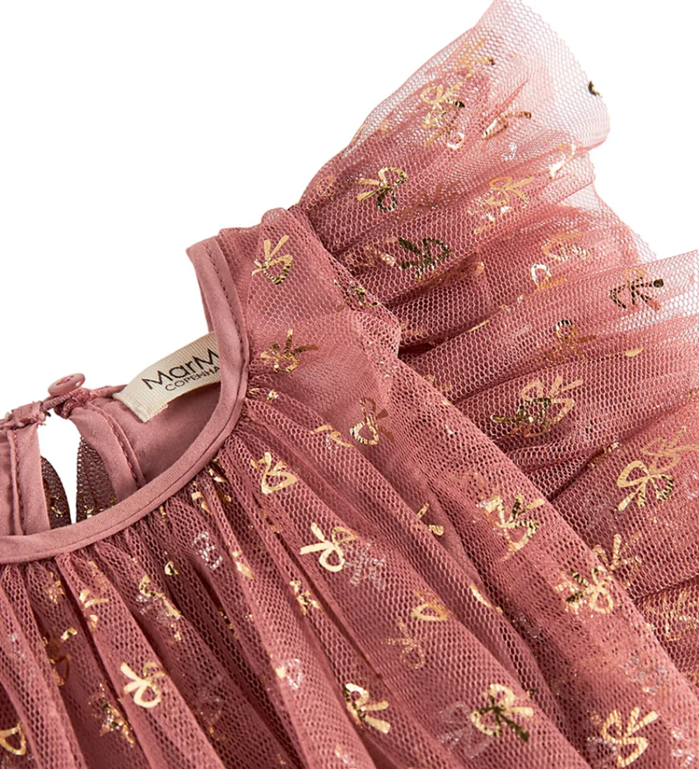 Elegant MarMar kjole i en smuk støvet rosa nuance, dekoreret med fine guldfarvede sløjfer. Kjolen har korte ærmer med voluminøse flæser, der giver et stilfuldt udtryk. MarMar kjolen er fremstillet i et let og luftigt materiale med lag, der skaber en flot silhuet.