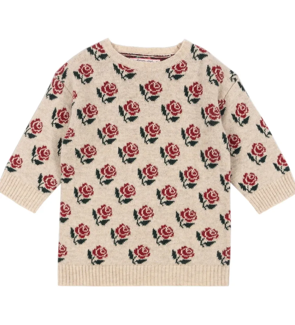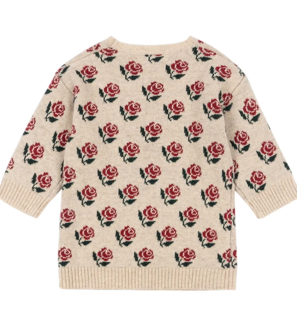 Fin Konges Sløjd kjole i beige med røde roser med grønne blade. Konges Sløjd kjolen har ribkanter ved hals og ærmer, hvilket fuldender designet. Kjolen er lavet i en strikket kvalitet i en blød og lun uldblanding.
