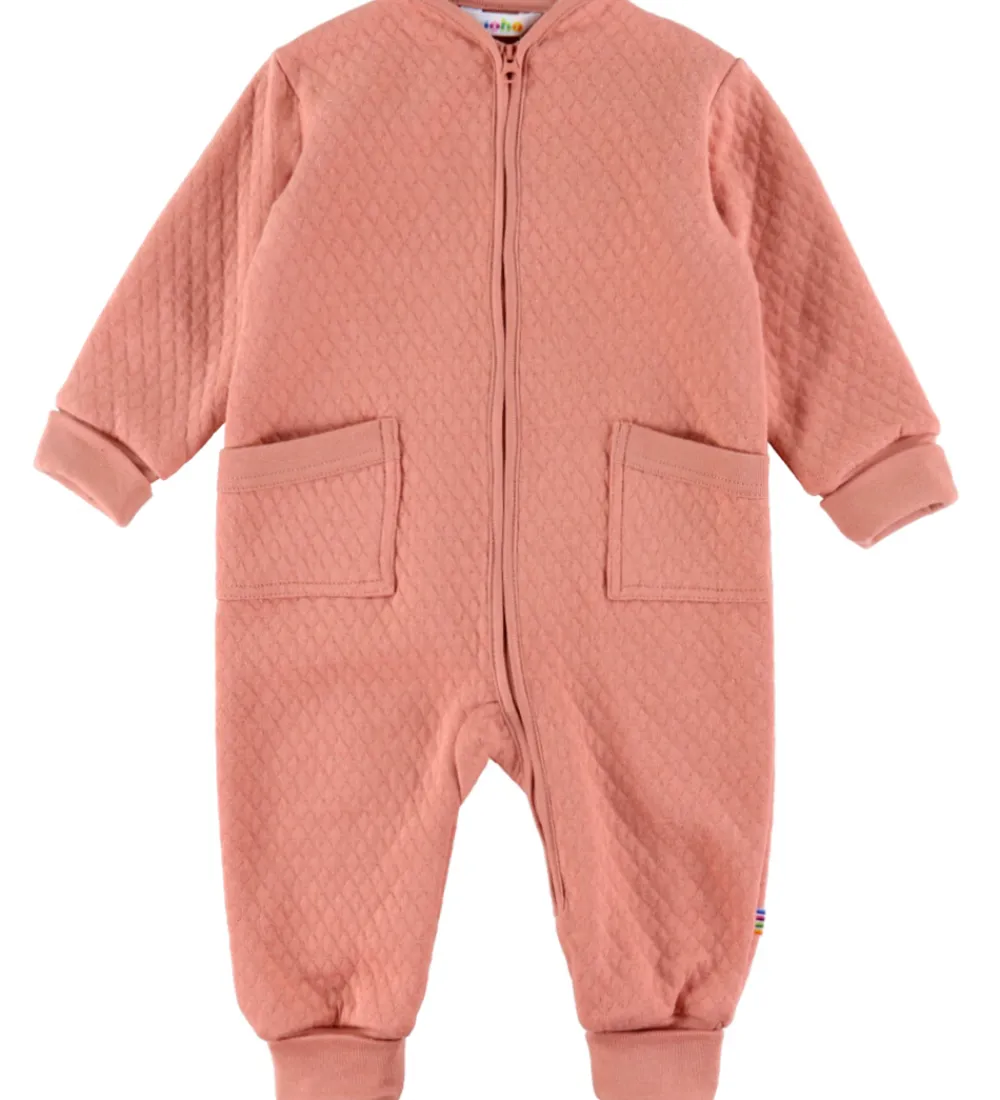 Flot Joha køredragt i en lækker laksefarve med markante åbne lommer på forsiden. Dragten har en smuk quiltet struktur, hvilket giver et elegant og stilrent udtryk.