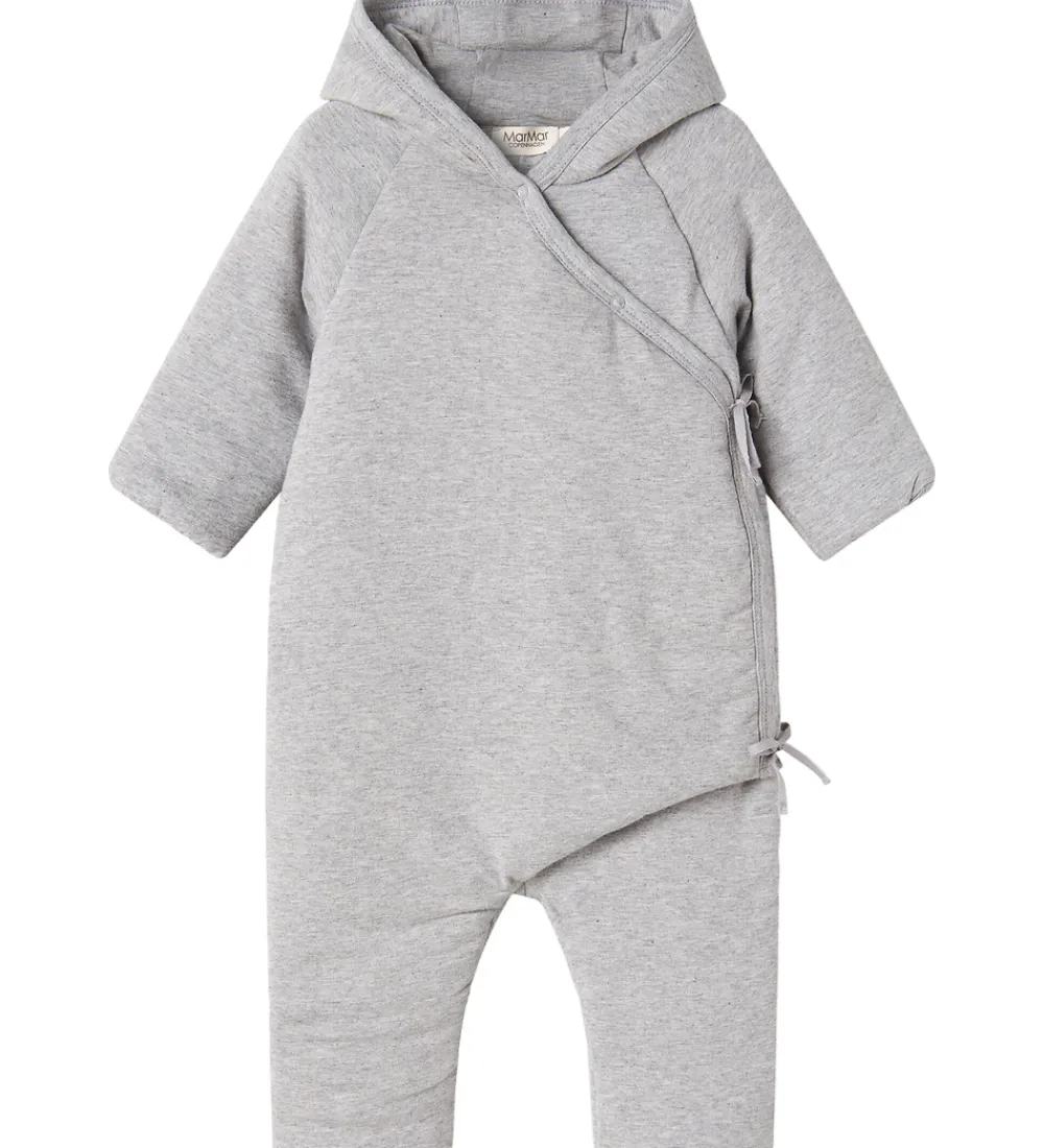 Køredragten har lange ærmer og ben med ombuk samt en praktisk hætte. Den har en slå-om åbning med bånd og trykknapper for nem påklædning. MarMar køredragten er lavet i blødt materiale og har en let vattering, der giver en behagelig pasform.