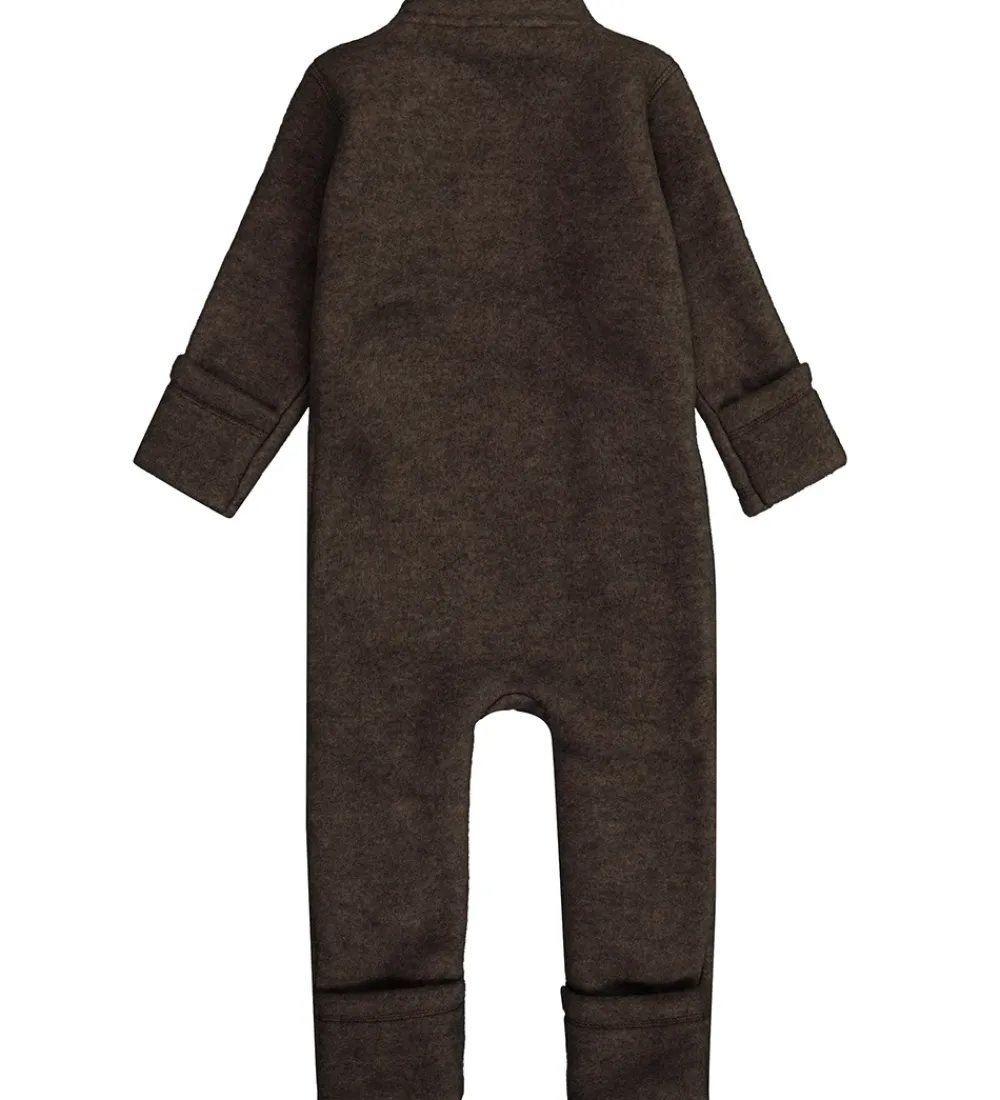 Blød Mikk-Line køredragt af filtet uld i meleret brun med et lille, brunt logo på venstre ærme.