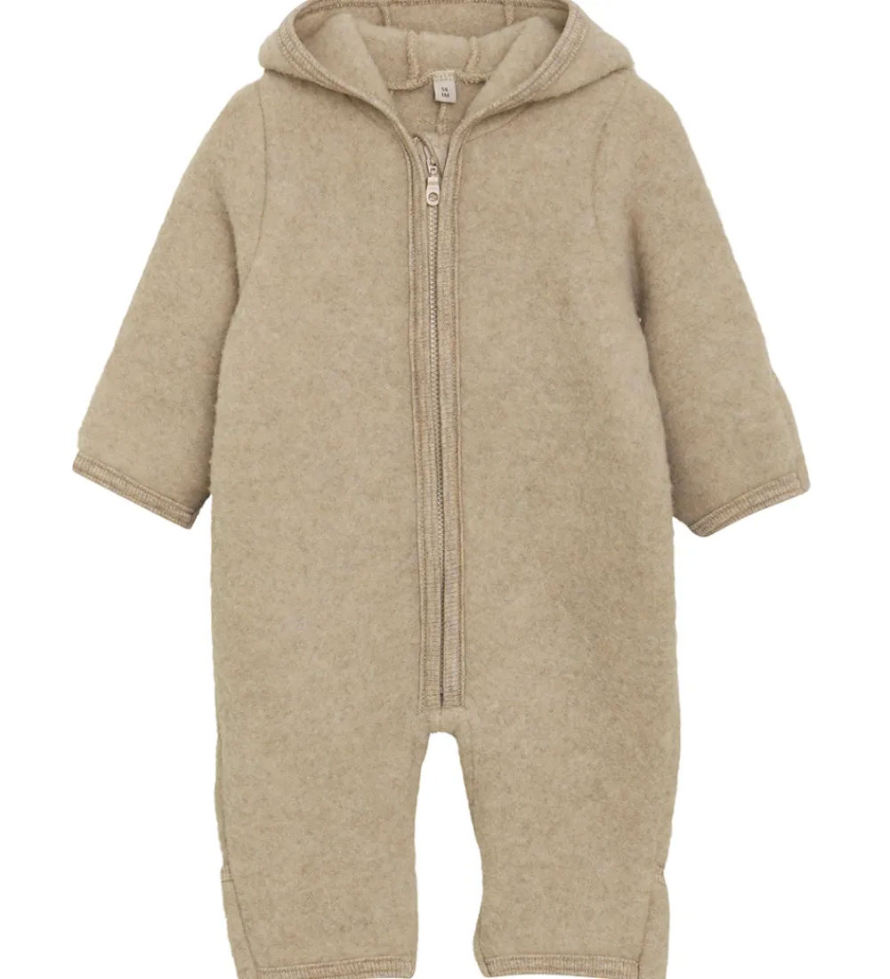 Praktisk Huttelihut køredragt af lunt uldfleece i en meleret, lysebeige nuance. I nakken er der en logopatch.