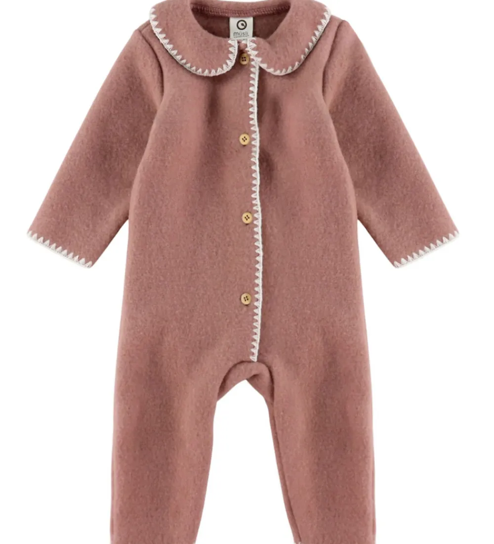 Elegant Müsli køredragt af uldfleece i en ensartet, mørk rosa farve med dekorative syninger langs kanterne.