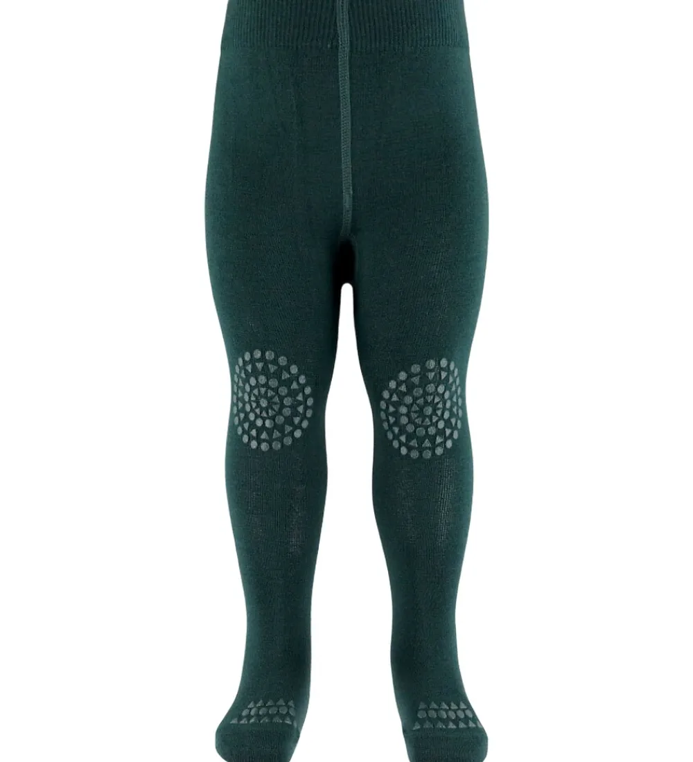 Dejlige GoBabyGo strømpebukser i ensfarvet mørkegrøn med praktiske gummidutter på og under foden samt på knæene.