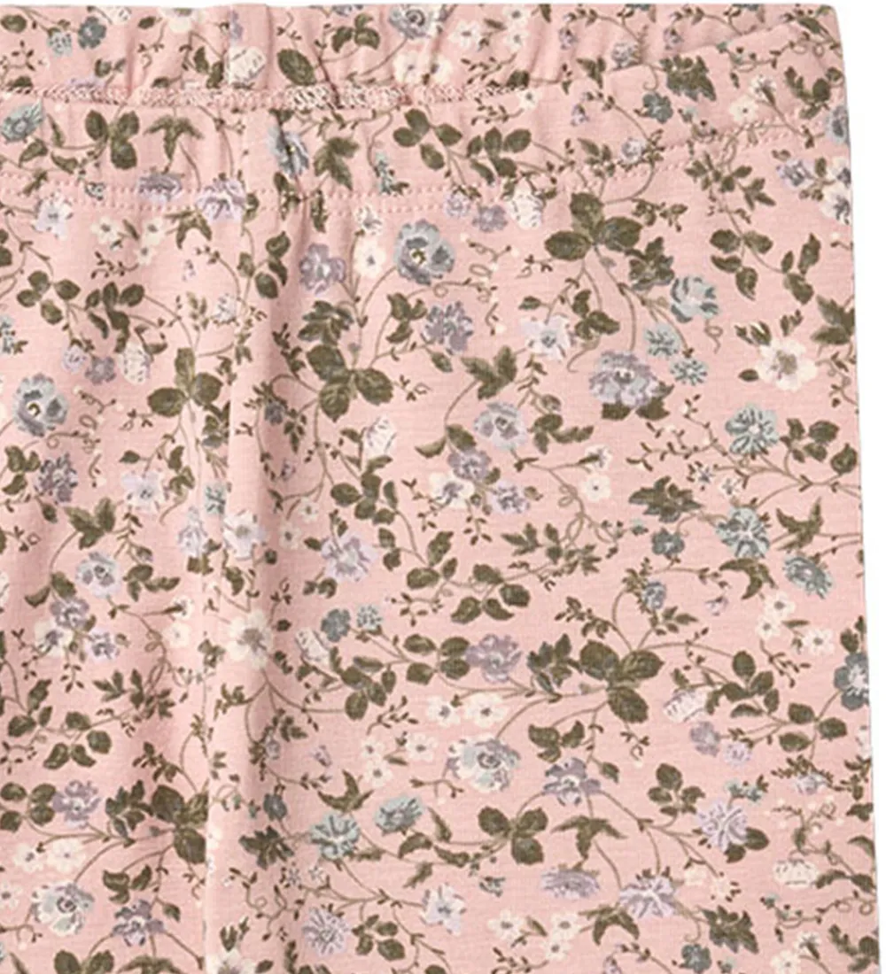 Flotte Wheat leggings i lys rosa med et allover småblomstret print i hvide, grønne og blå nuancer. Wheat leggingsene har en elastisk talje for en fleksibel pasform.