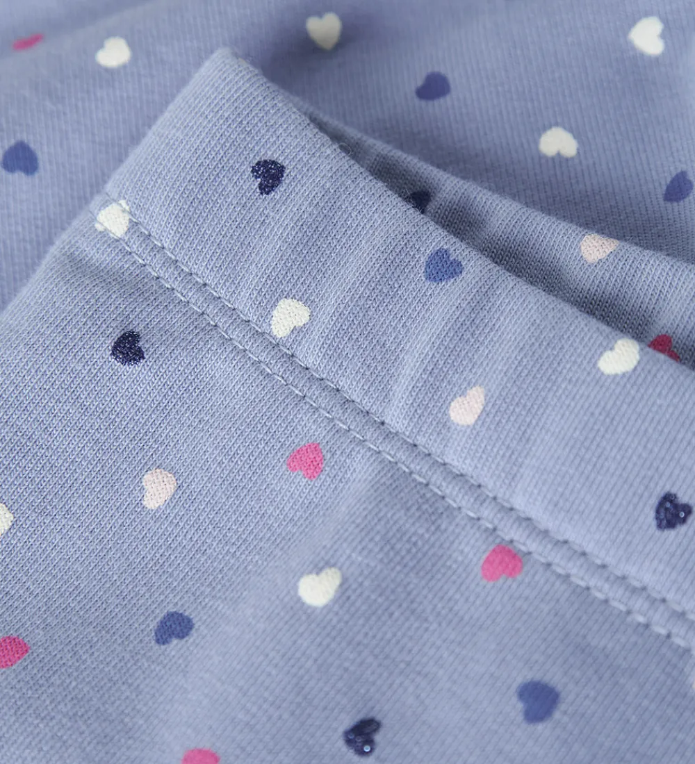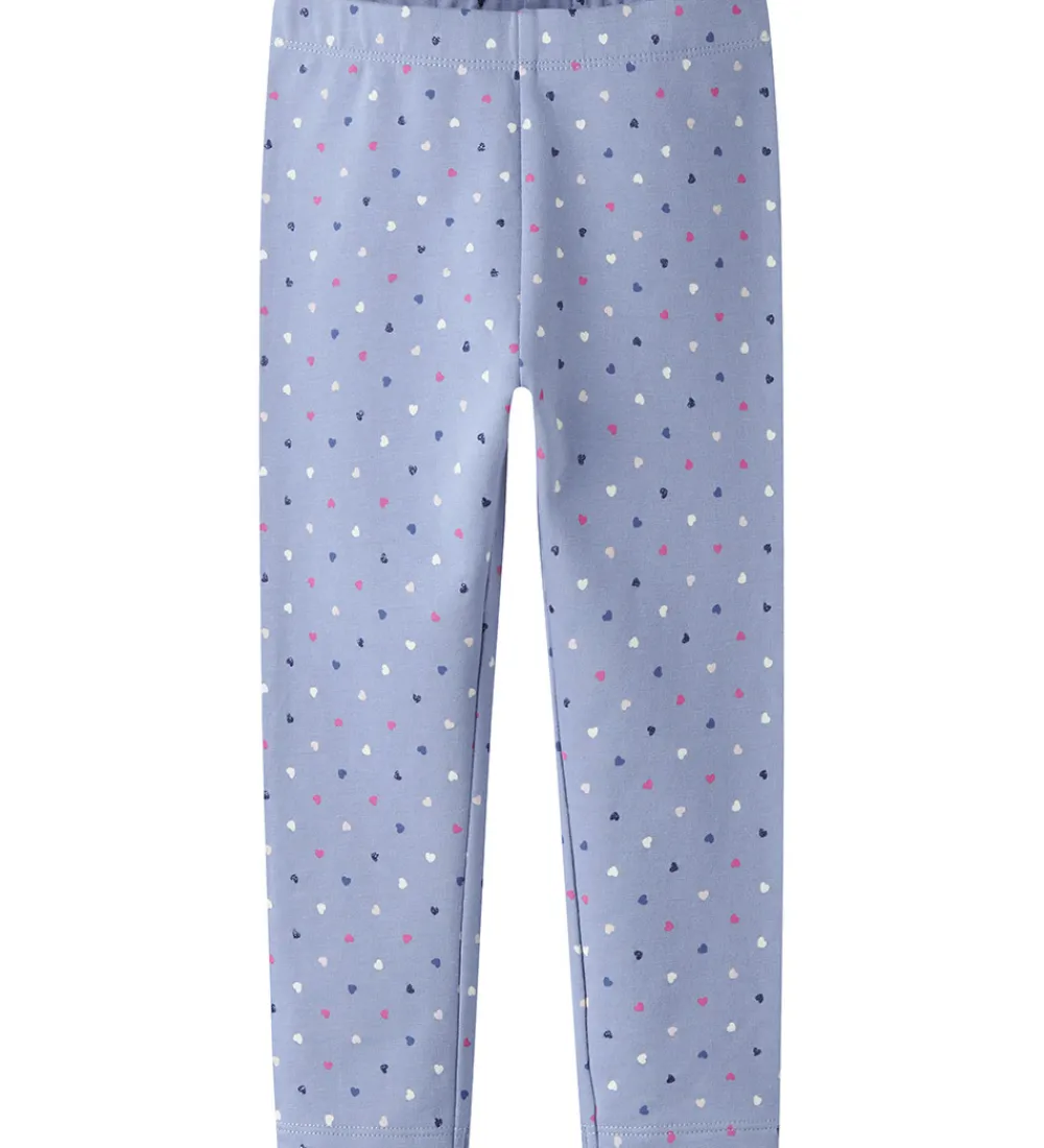 Skønne Name It leggings i lyseblå med et alloverprint af små hjerter i hvide, rosa og blå nuancer med glimmer. Name It leggingsene har en elastik i taljen og en blød, børstet inderside.