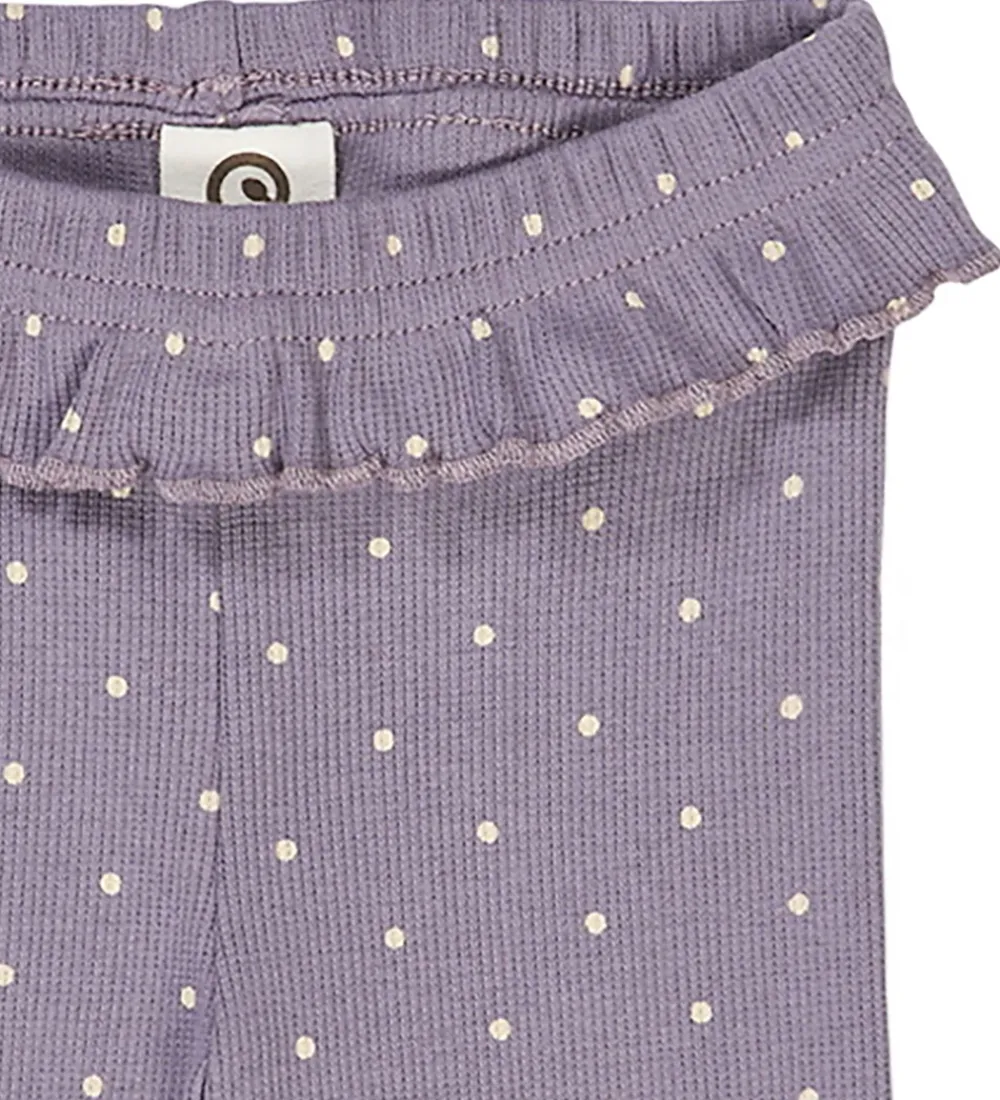Charmerende Müsli leggings i en lilla nuance med små, beige prikker og en lækker ribstruktur. Müsli leggingsene har en elastisk talje med en dekorativ flæsekant.