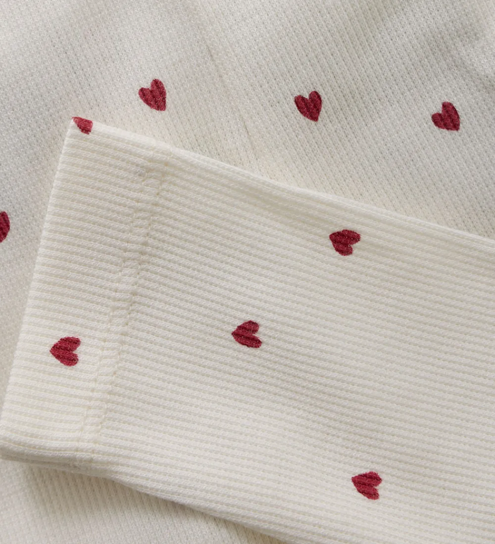 Charmerende Minymo leggings i hvid med små røde hjerter overalt og med en flot ribstruktur. Minymo leggingsene har en elastisk talje, der sikrer en behagelig pasform.