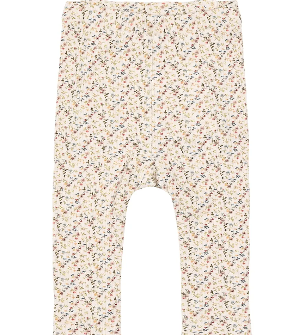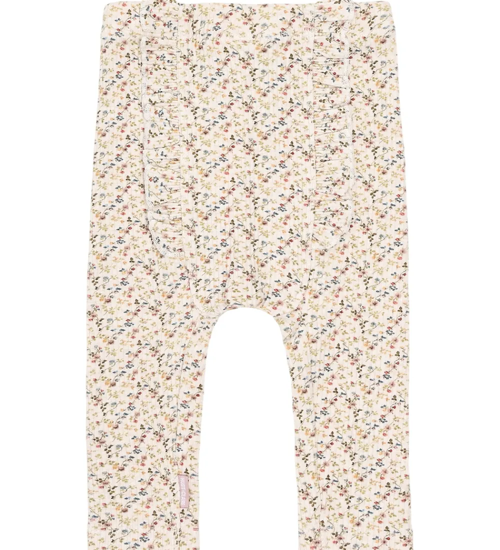 Fine Hust and Claire leggings i beige med blomsterprint i flotte farver. Leggingsene har ribstruktur og elastisk talje. Bagpå er der flotte flæsedetaljer, og i benåbningerne er der blondekanter i rosa. Leggingsene er fremstillet af økologisk bomuld og modal.
