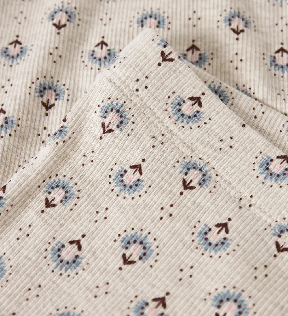Fine Name It leggings i en lys cremefarve med et blomsterlignende mønster i blå, brun og rosa. Name It leggingsene har ribstruktur og en elastisk talje, som giver en god pasform.
