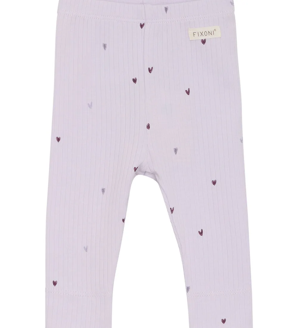 Dejlige Fixoni leggings i en lys lilla nuance med et charmerende hjerteprint. Fixoni leggingsene har en ribbet struktur og en elastisk talje, der sikrer en god pasform.