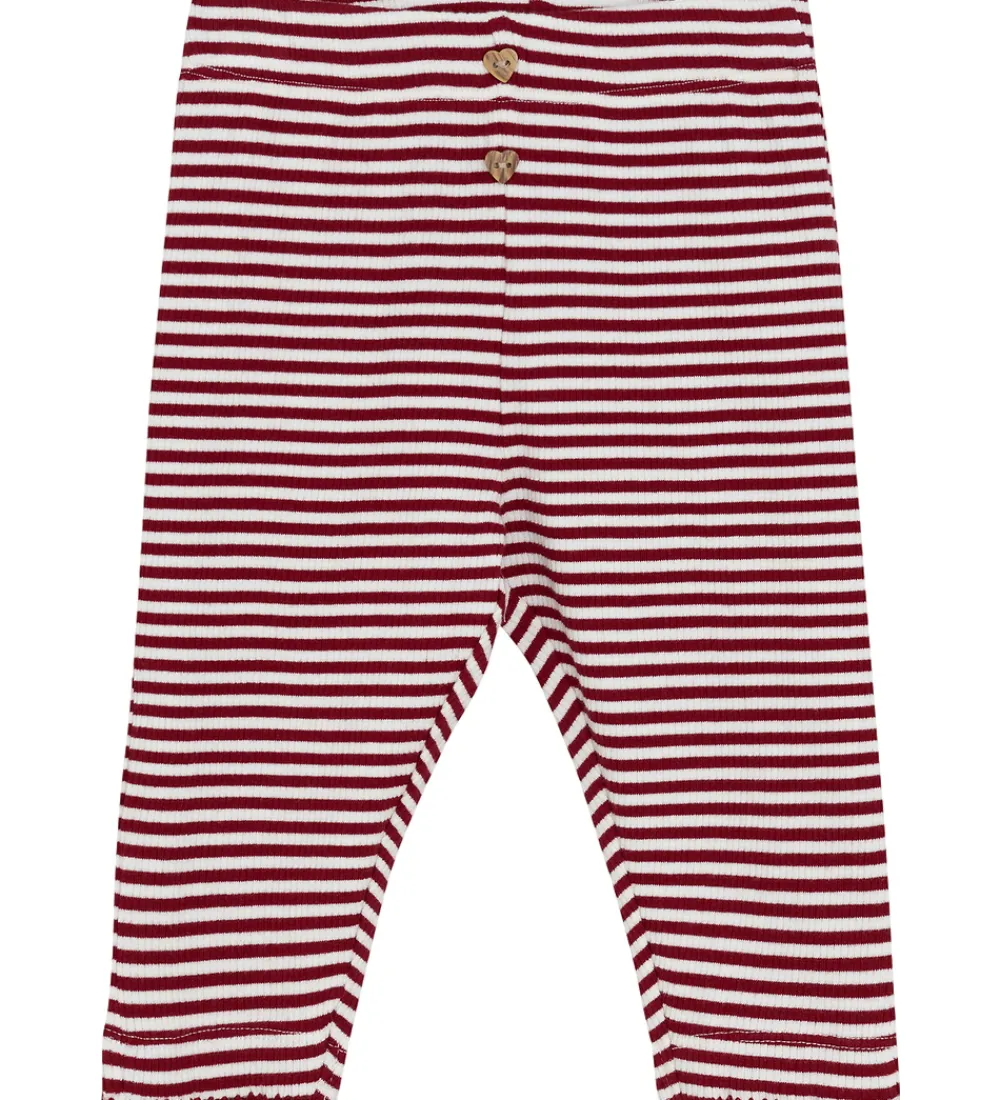 Stilfulde Minymo leggings med vandrette striber i rød og hvid. Leggingsene har ribstruktur og to hjerteformede knapper fortil. De har en behagelig pasform og bølgede kanter i benåbningerne.