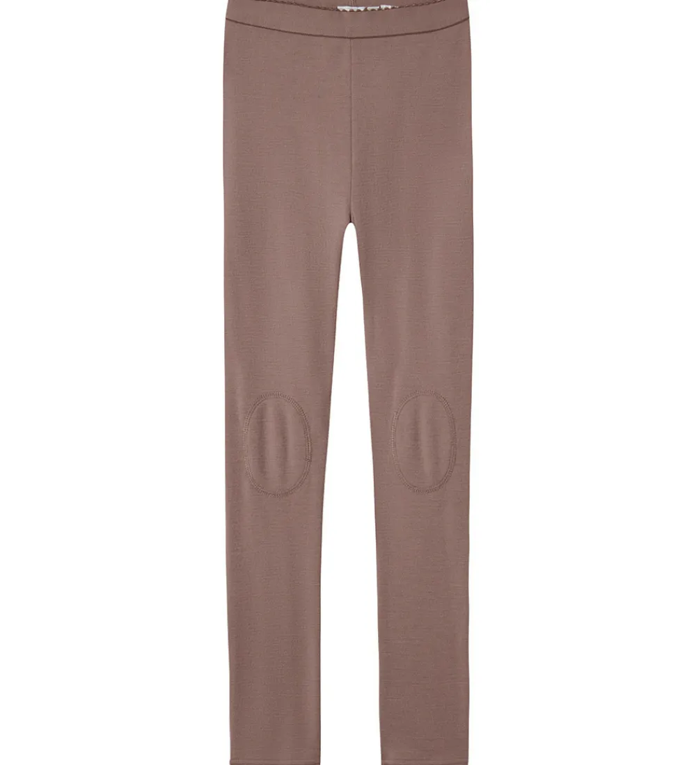 Bløde Name It leggings i støvet rosa. Name It leggings har en elastisk talje med en fin bølget kant og dekorative syninger på knæene. Legginsene er fremstillet af blødt merinould.