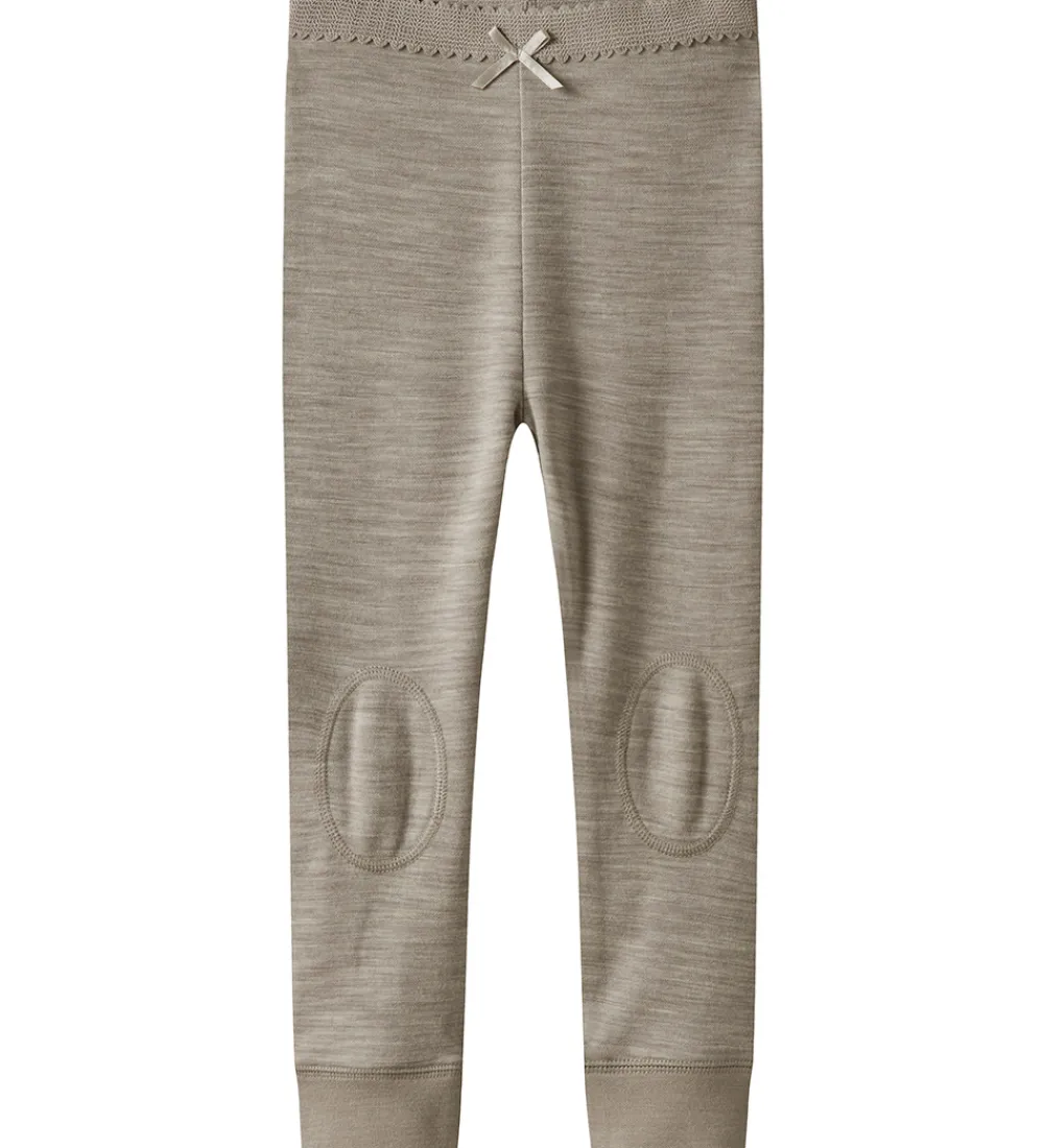 Lækre Name It leggings i meleret gråbrun med en dekorativ sløjfe foran og syninger på knæene. Leggingsene har en elastik med blonde i taljen og ribkanter ved anklerne. De er fremstillet af merinould og viskose.