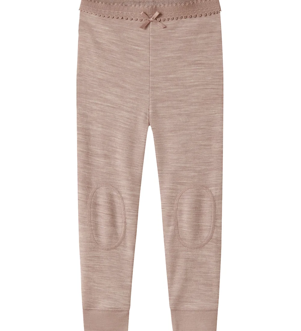 Fine Name It leggings i meleret rosa med en dekorativ sløjfe foran og syninger på knæene. Leggingsene har en elastik med blonde i taljen og ribkanter ved anklerne. De er fremstillet af merinould og viskose.
