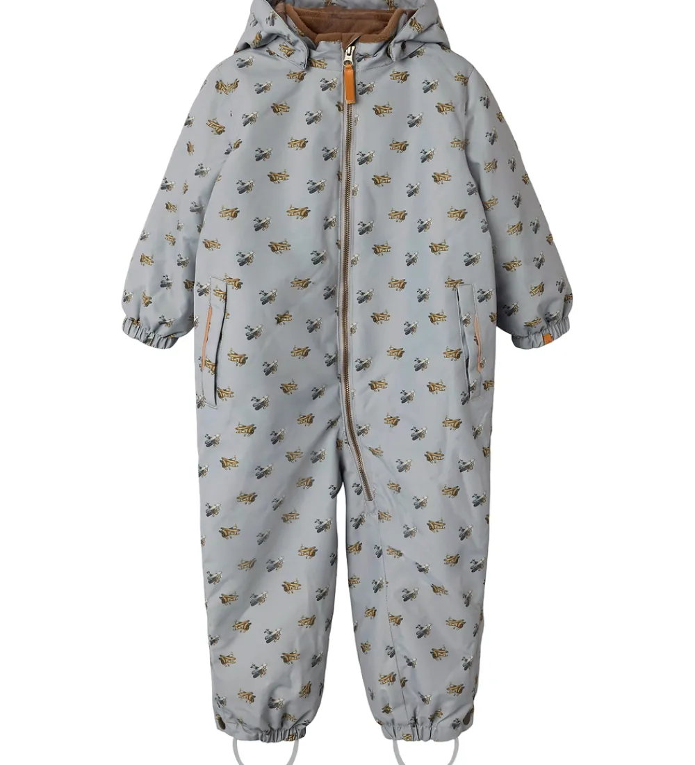 Smart Lil’ Atelier flyverdragt i grå med et alloverprint af flyvemaskiner i afdæmpede nuancer. Flyverdragten har velplacerede refleksprint og -detaljer.
