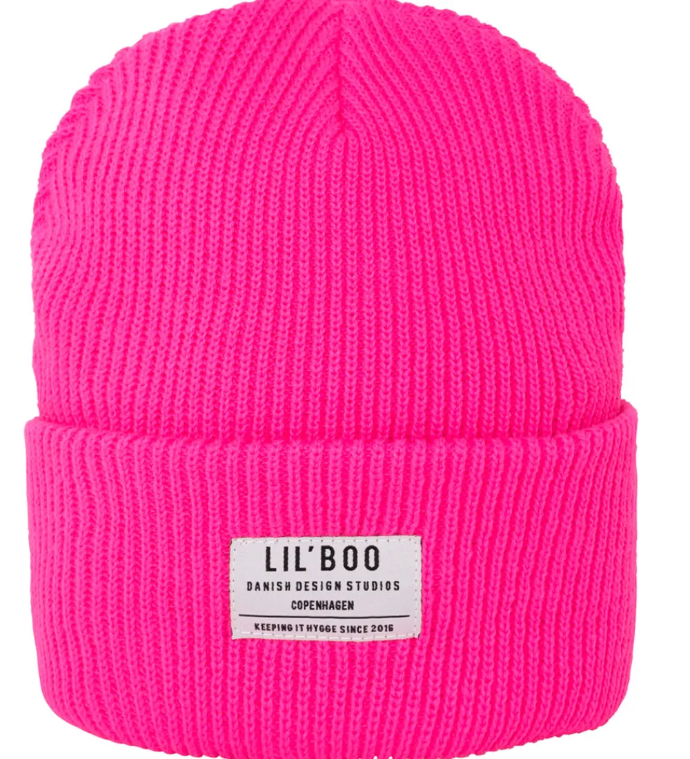 Stilfuld Lil’ Boo Copenhagen hue i en livlig neonpink farve med et synligt logo foran, der tilføjer et karakteristisk præg.