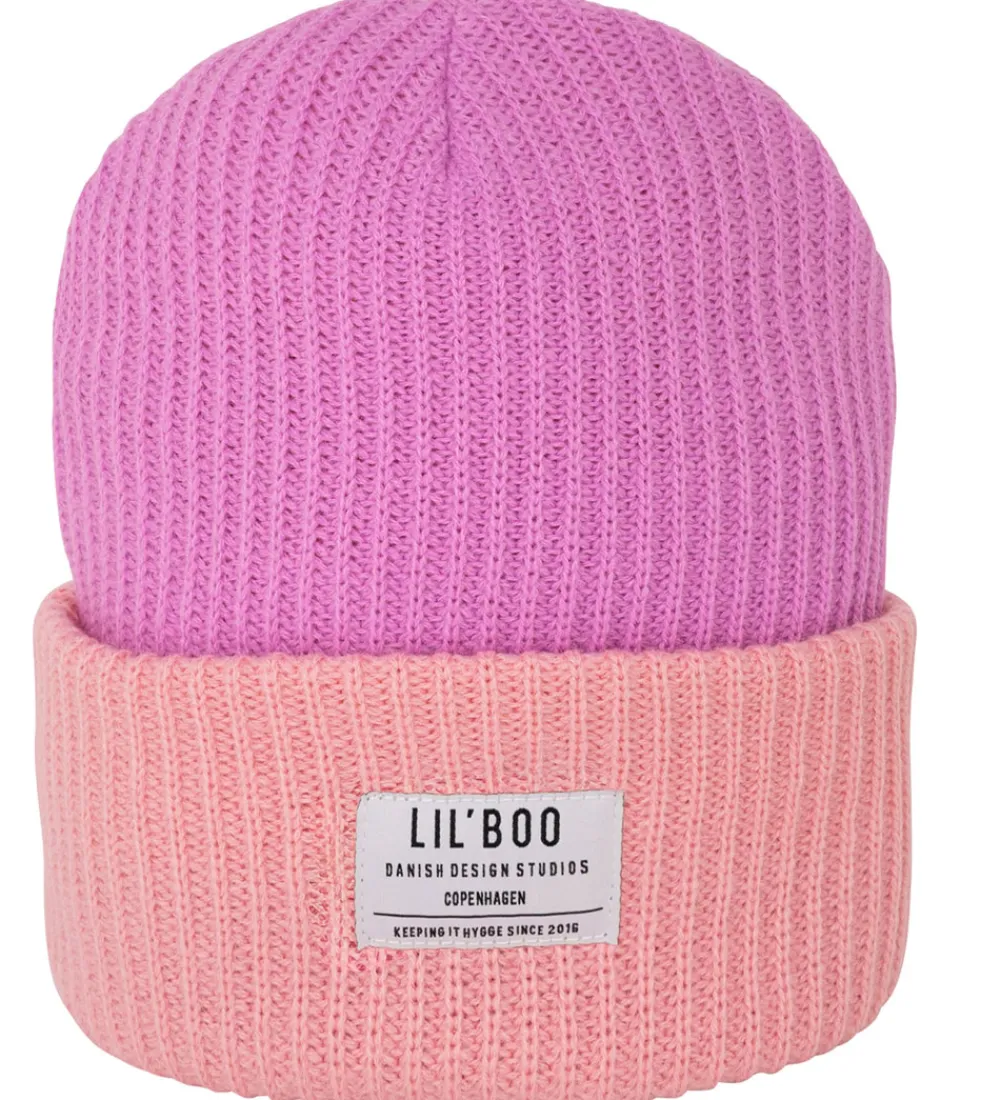 Stilfuld Lil’ Boo Copenhagen hue i lys lilla og rosa med et synligt logo foran, der tilføjer et karakteristisk præg.