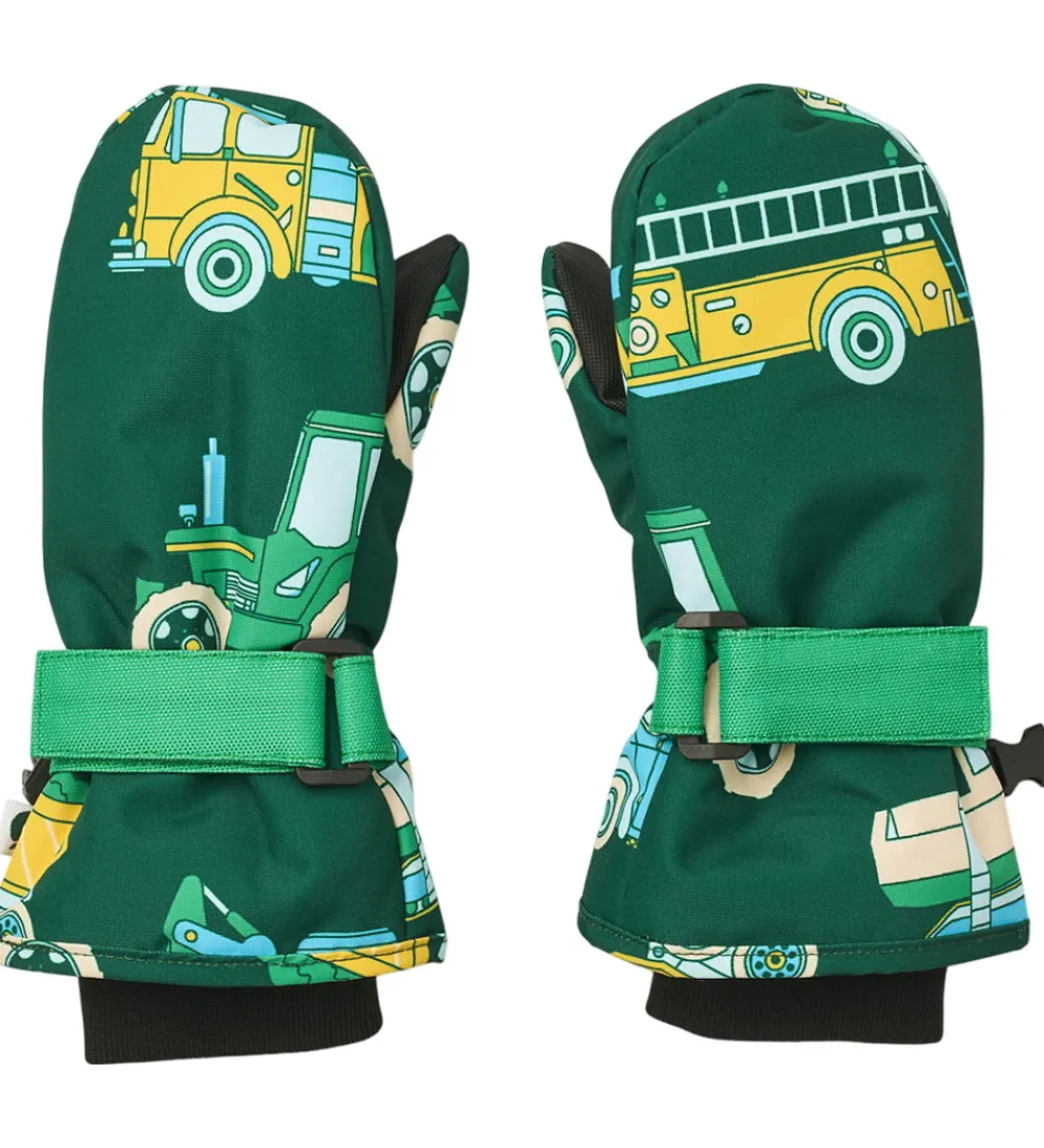 Lune Småfolk luffer i mørkegrøn med et alloverprint af farverige arbejdsbiler.