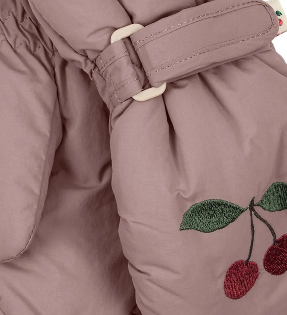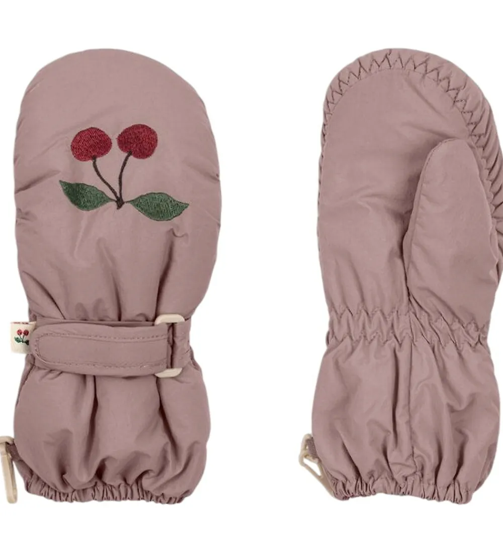 Fine Konges Sløjd luffer i en mørkerosa nuance og med e broderet kirsebær på toppen.